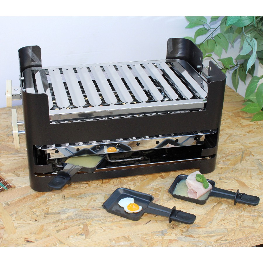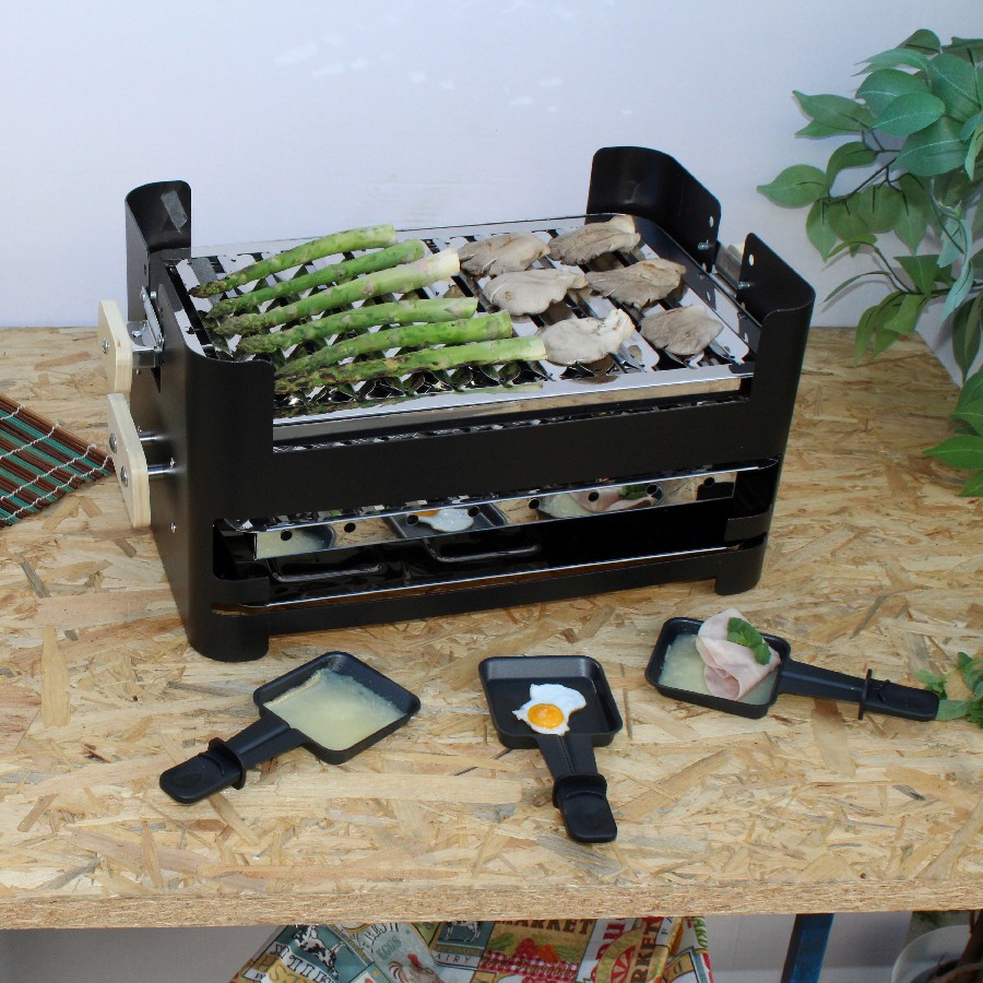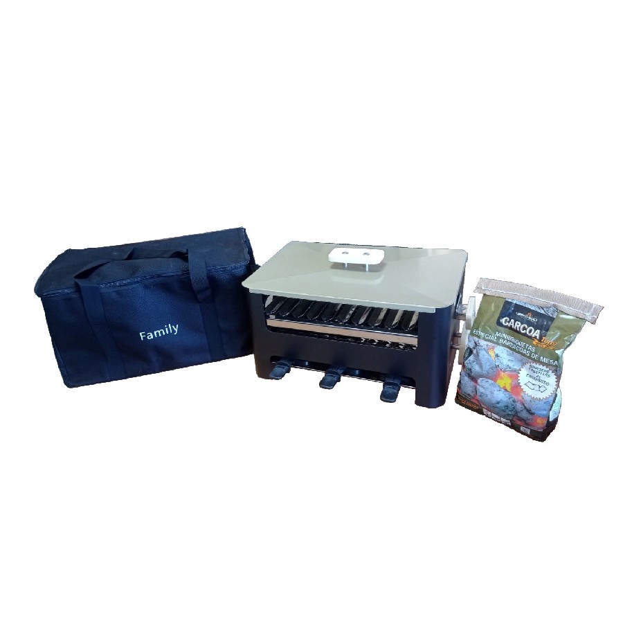 The barbecue includes a set of practical accessories, such as six non-stick pans, a high-quality carrying bag, and a 1 kg spark-resistant charcoal bag, allowing you to start grilling right away.