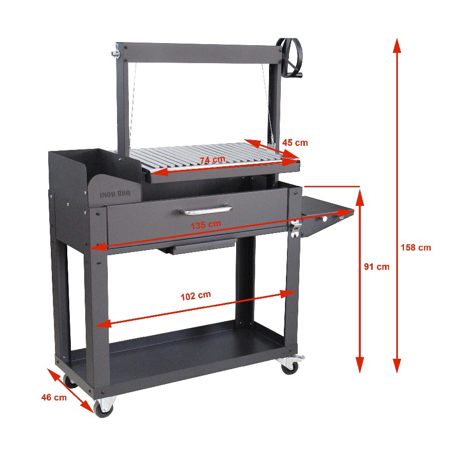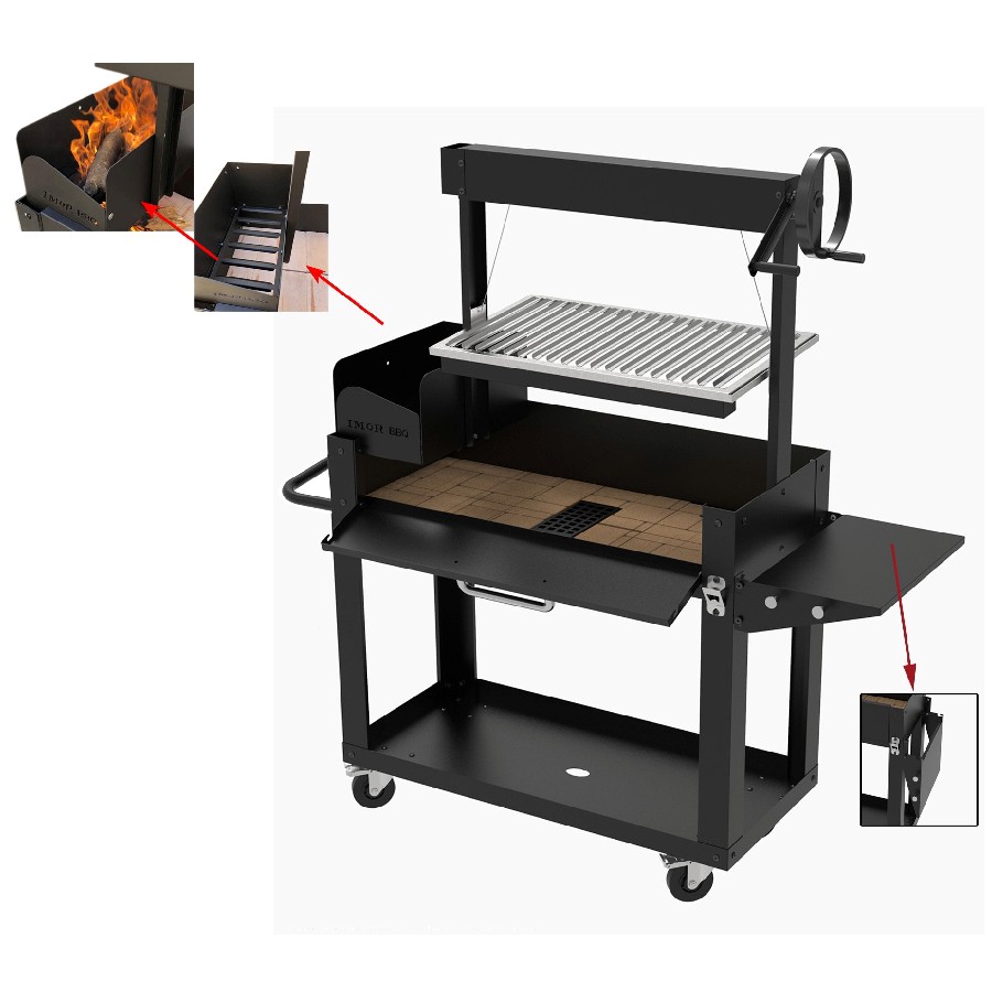 The IMOR® Lenagrill barbecue is ideal for authentic charcoal and wood grilling, offering a traditional Argentine barbecue experience. The V-shaped stainless steel grill (without welds) prevents chemical transfer to food, ensuring a healthier cooking process.