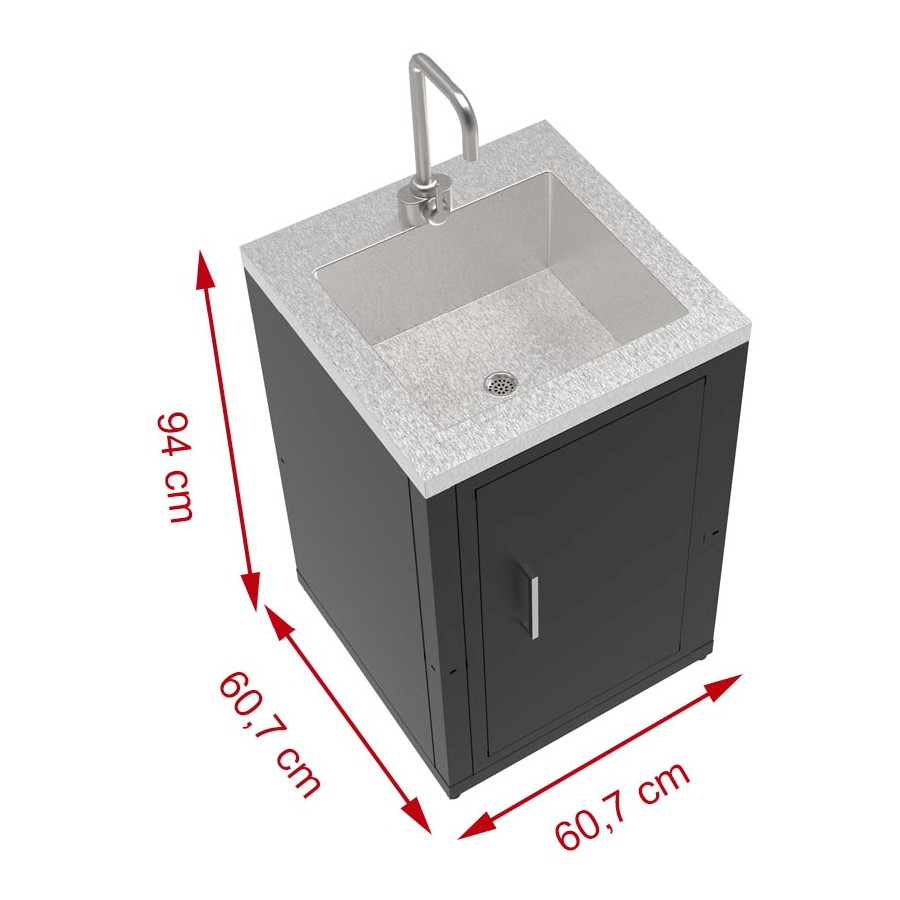 The IMOR® sink module is the perfect solution for equipping outdoor kitchens with functionality and durability. Its AISI 304 stainless steel countertop offers high durability, resistance to corrosion, and easy cleaning. This sink modules includes a soundproof sink with an anti-overflow system, a drain valve with a sealing gasket, and an anti-odor siphon. Its stainless steel faucet provides both cold and hot water, with connection hoses included.