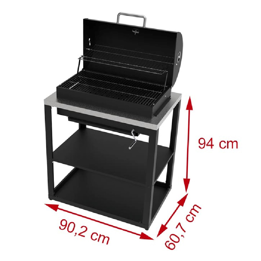 Its charcoal combustion system allows for traditional cooking with the option to smoke, thanks to its lid with airflow controllers and an integrated thermometer, enabling precise temperature control. It features a height-adjustable charcoal tray via a rotating crank, providing complete control over heat intensity.