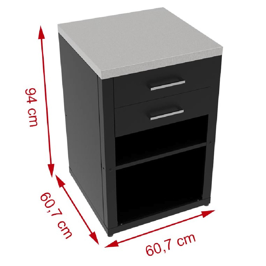 Designed to optimize storage space, it features two organizational levels: an intermediate and a lower tray, perfect for kitchen utensils and accessories. It also includes two large drawers with stainless steel handles, mounted on guides that ensure smooth and secure opening and closing, preventing accidental falls.