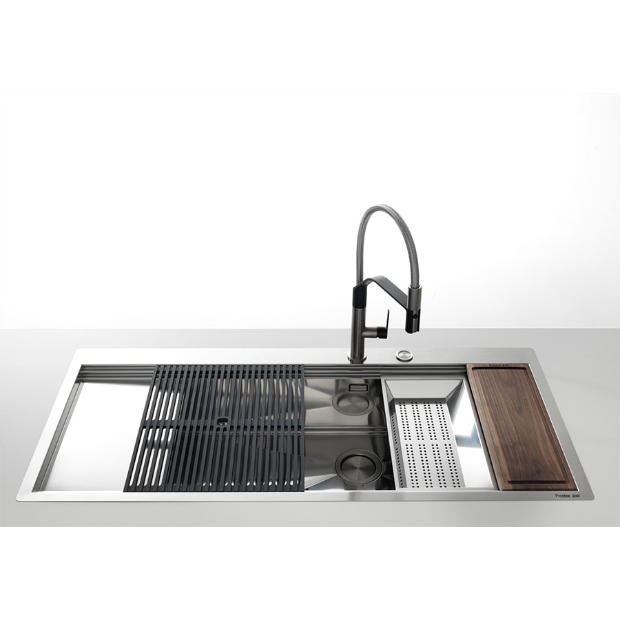 The Foster Sink Milanello Workstation is a multifunctional kitchen solution that combines practicality with modern design. Crafted from premium stainless steel, it offers durability and resistance to scratches and stains. This innovative workstation features a deep, spacious sink integrated with accessories like cutting boards and colanders, streamlining meal prep and cleanup. Its ergonomic design maximizes efficiency by transforming the sink area into a versatile workspace. The sleek look of the Milanello Workstation fits seamlessly into contemporary kitchens, providing both functionality and aesthetic appeal. Ideal for busy households, it enhances the overall kitchen experience with its smart, space-saving design.