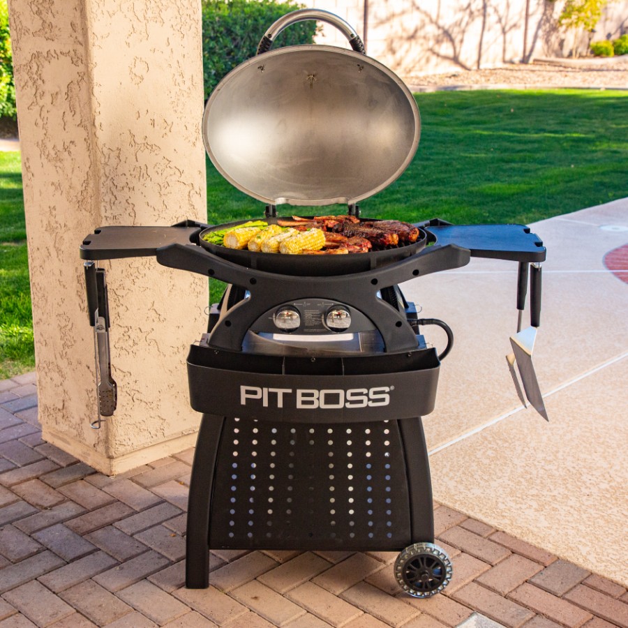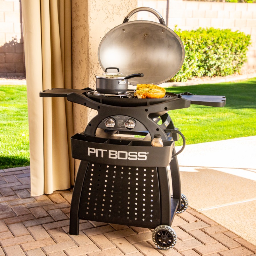Bring the bold flavors of grilled foods everywhere you go with the Pit Boss Sportsman 2 Portable Gas Grill. Featuring two stainless steel gas burners and an impressive 2,359 square centimeters of porcelain enamel cast iron cooking space, you can prepare deliciously grilled foods for your family and friends in your backyard or on the go. The durable cast aluminum lid and body features a high dome design, allowing you to grill large items like a full chicken or turkey. Additionally, the powerful heat output, powered by our innovative advanced ignition system, lets you decide if you would like to cook with the lid open or closed. The Pit Boss Sportsman 2 features two burners that allow you to operate various temperature zones on your grill at the same time. You can operate one side on high and use a trivet to boil a pot of water while simultaneously cooking pancakes on a griddle on a low heat setting on the other. This grill also includes a thermometer built into the lid, chrome knobs and handles, folding side shelves with tool hooks for easy transport and wind protection, and a removeable grease tray.
