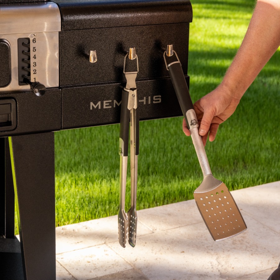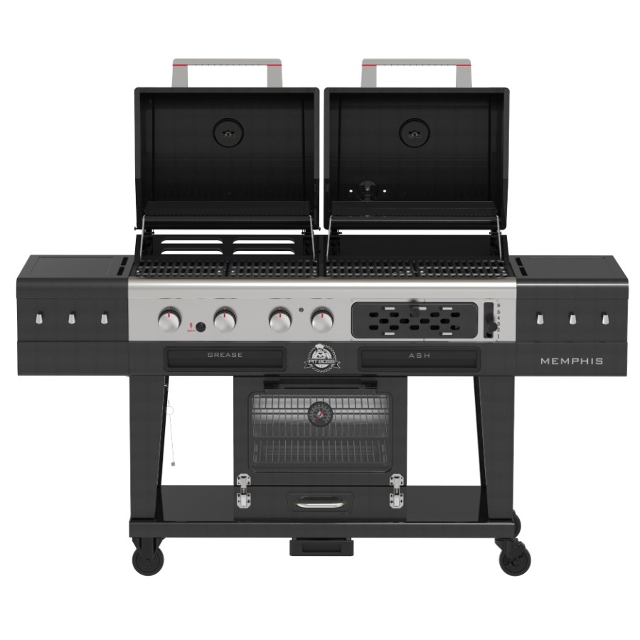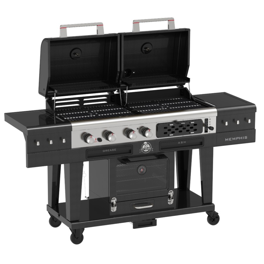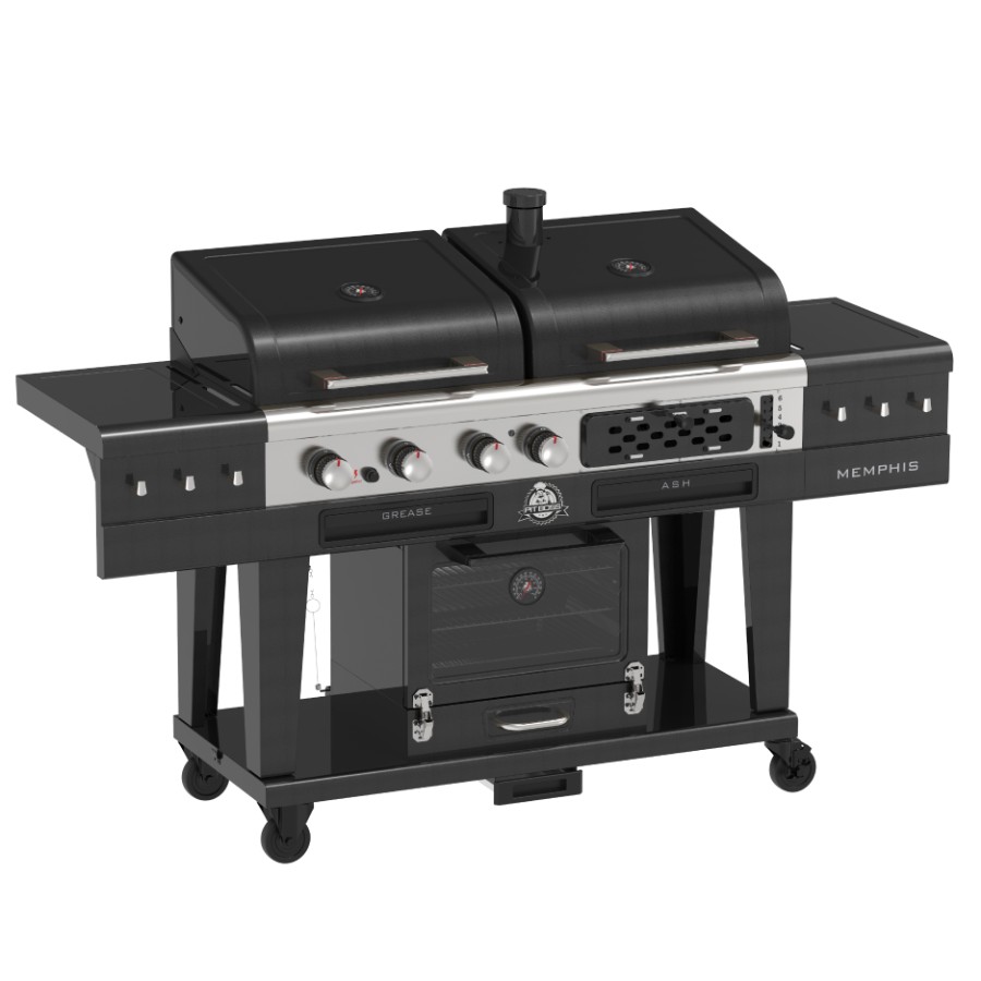 The Pit Boss Memphis Ultimate 2.0 is the second generation of the most versatile grill on the market. What started as a first of its kind, this 4 in 1 grill is a masterful combination of a gas grill, a charcoal barbeque, a glass-doored electric smoker with cold smoking capabilities in a single machine. Char-grill brats or barbecue kebabs on your 30,000 BTU 3 burner gas grill. Grill your favorite meats and veggies on your charcoal grill, with a 6-position grade adjustment, front air intake and rear chimney exhaust. Smoke a 20 lb turkey or use the 3 racks and cold smoke cheese in the analog electric smoker. The newly designed Memphis Ultimate 2.0 now allows for a faster assembly so you can get cooking sooner! If that weren’t enough, the Memphis Ultimate 2.0 also comes equipped with tool hooks, a side shelf for preparation, and locking caster wheels for mobility.