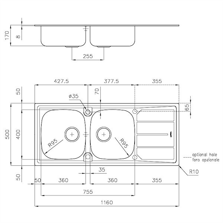 The Foster Sink S1000 is designed for both functionality and durability, making it an excellent choice for modern kitchens. One of its standout features is the option for 2nd and 3rd holes, allowing for customization based on your needs. These additional holes can accommodate double-hole mixers, remote-controlled drains, or soap dispensers, with positions clearly marked on the drawings using dotted lines for easy installation.