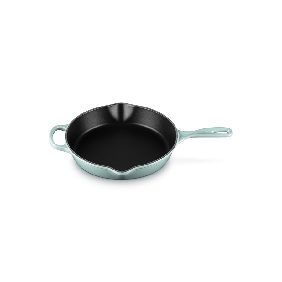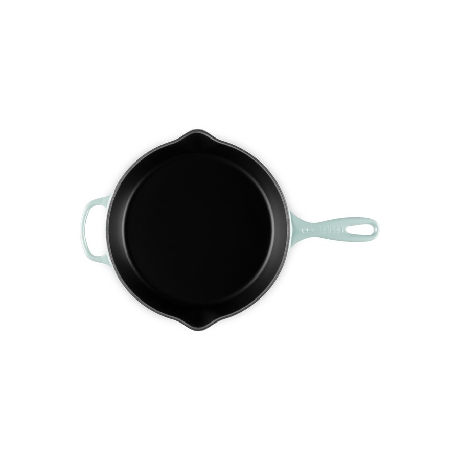 Crafted from Le Creuset's renowned enameled cast iron, the 26cm Deep Skillet in Sea Salt offers exceptional heat retention and even cooking, making it ideal for searing, sautéing, and baking. Its ergonomic handle and helper handle ensure easy maneuvering, while the dual pouring spouts provide drip-free serving. The Sea Salt hue, inspired by coastal tones, adds a touch of elegance to any kitchen.