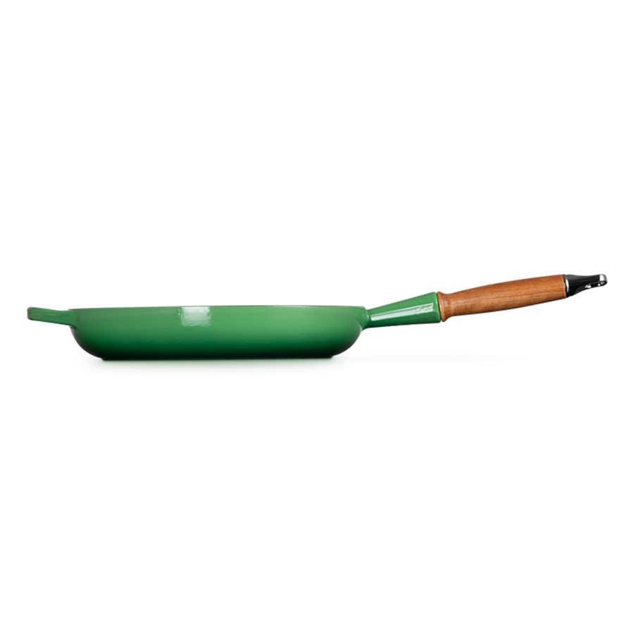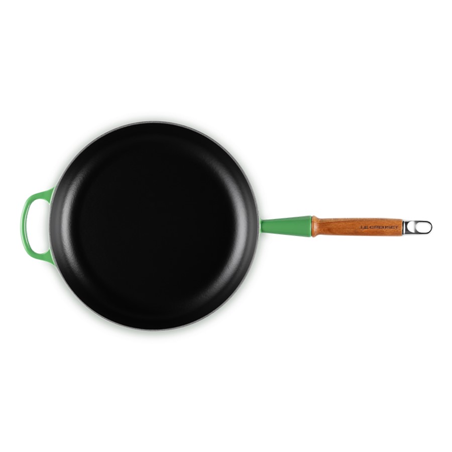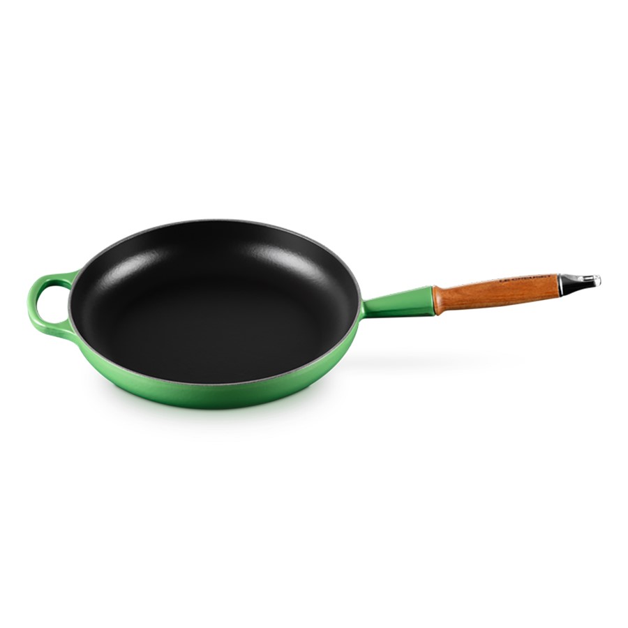 The Le Creuset Cast Iron Frying Pan with Wooden Handle blends classic cast iron durability with modern design. The enameled cast iron ensures excellent heat retention and even cooking, perfect for a variety of dishes. It is oven safe, withstanding high temperatures for versatile cooking methods. The wooden handle offers a comfortable grip but should be hand washed to preserve its quality, as the pan itself is not dishwasher safe. Ideal for searing, frying, and sautéing, this frying pan combines functionality with timeless style, making it a kitchen staple.