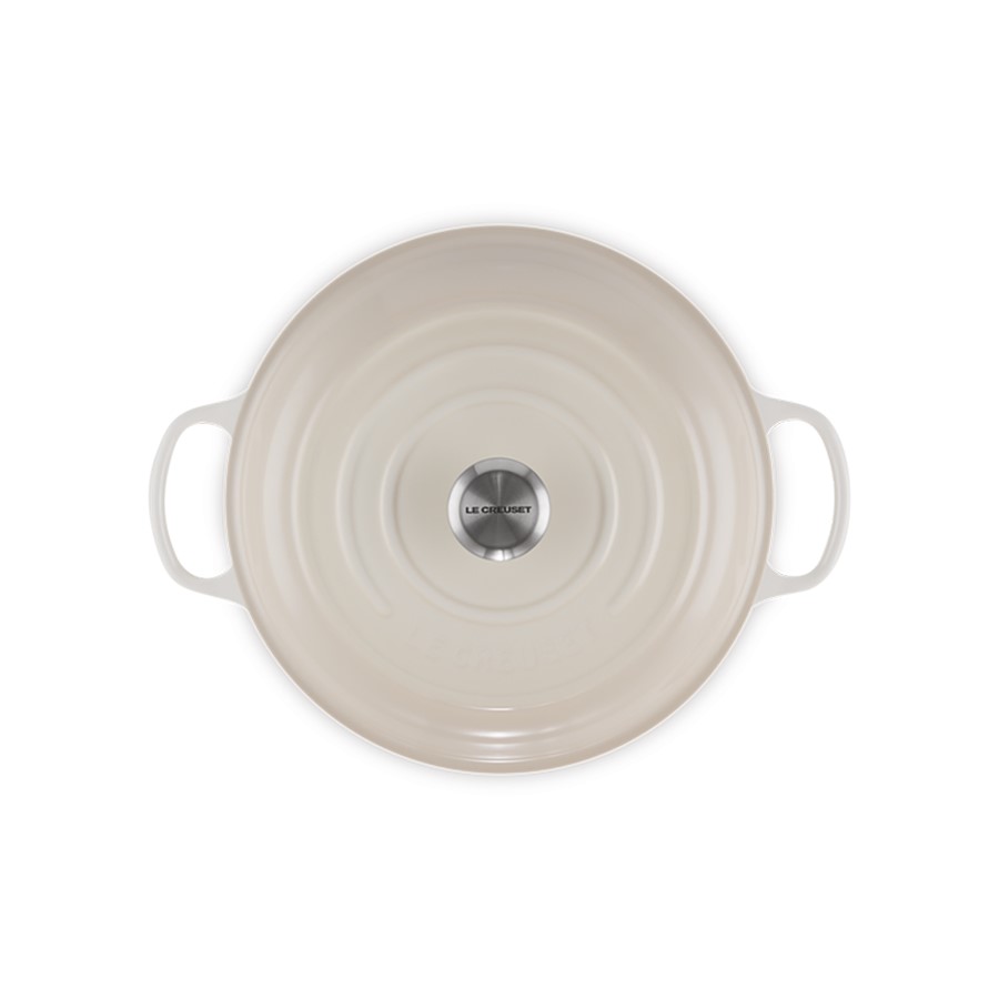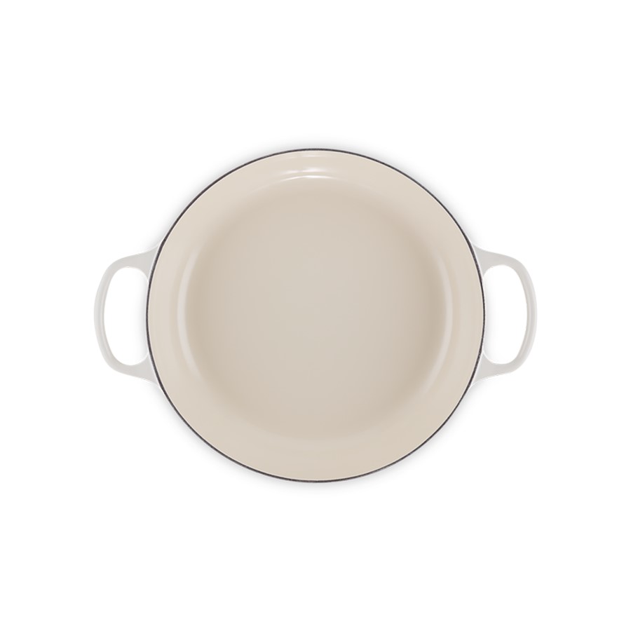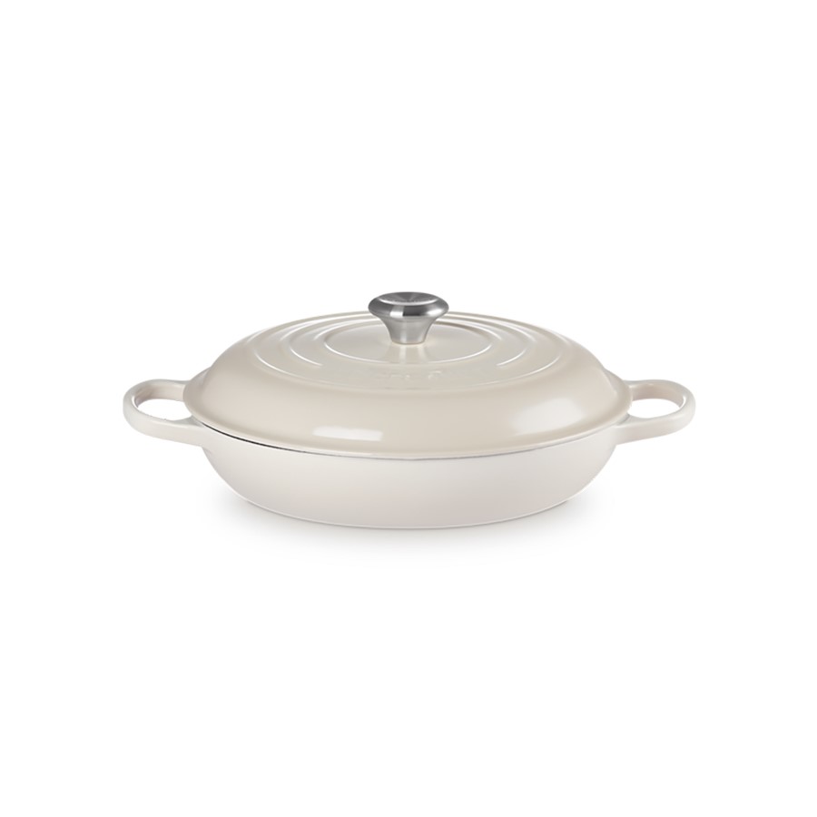 The Le Creuset Shallow Casserole/Braiser in Meringue, 26 cm, combines exceptional craftsmanship with a timeless, neutral hue. Crafted from durable cast iron, it ensures superior heat distribution and retention, making it ideal for braising, sautéing, and shallow frying. The Meringue color adds an elegant and understated touch to any kitchen, complemented by Le Creuset's renowned enamel finish. Perfect for preparing a variety of dishes, this shallow casserole dish effortlessly merges practical functionality with aesthetic appeal. Whether for everyday cooking or special occasions, it's an essential piece for chefs and home cooks who appreciate high-quality cookware that enhances both cooking performance and kitchen decor.