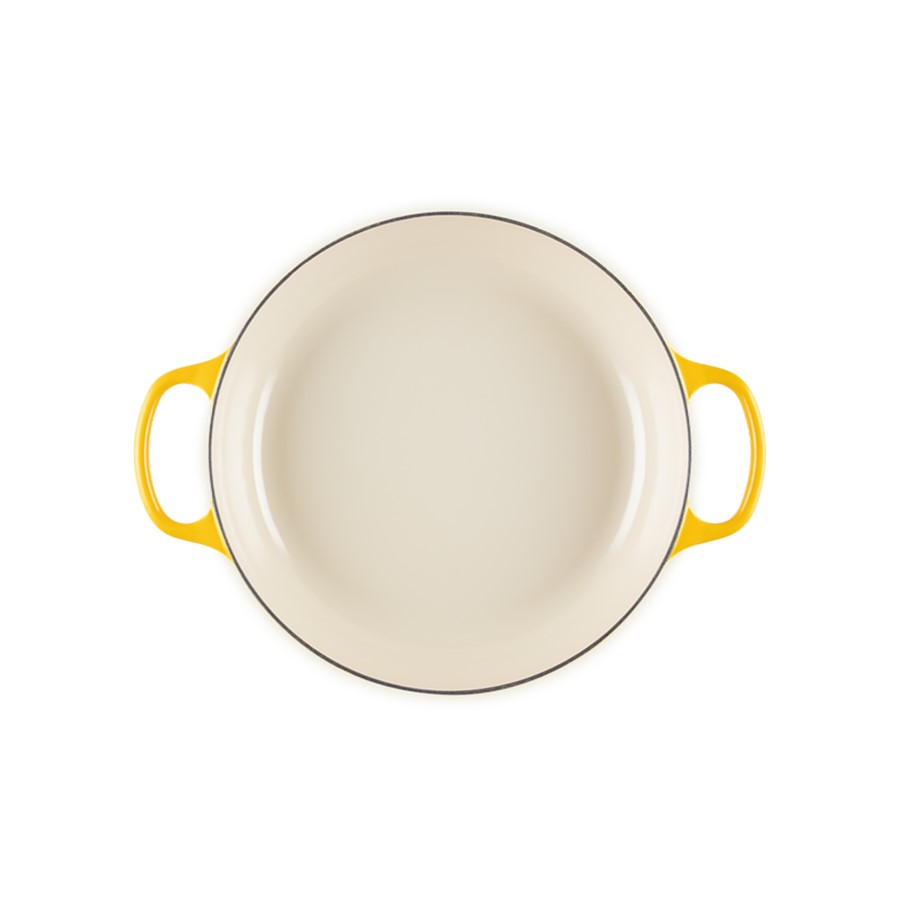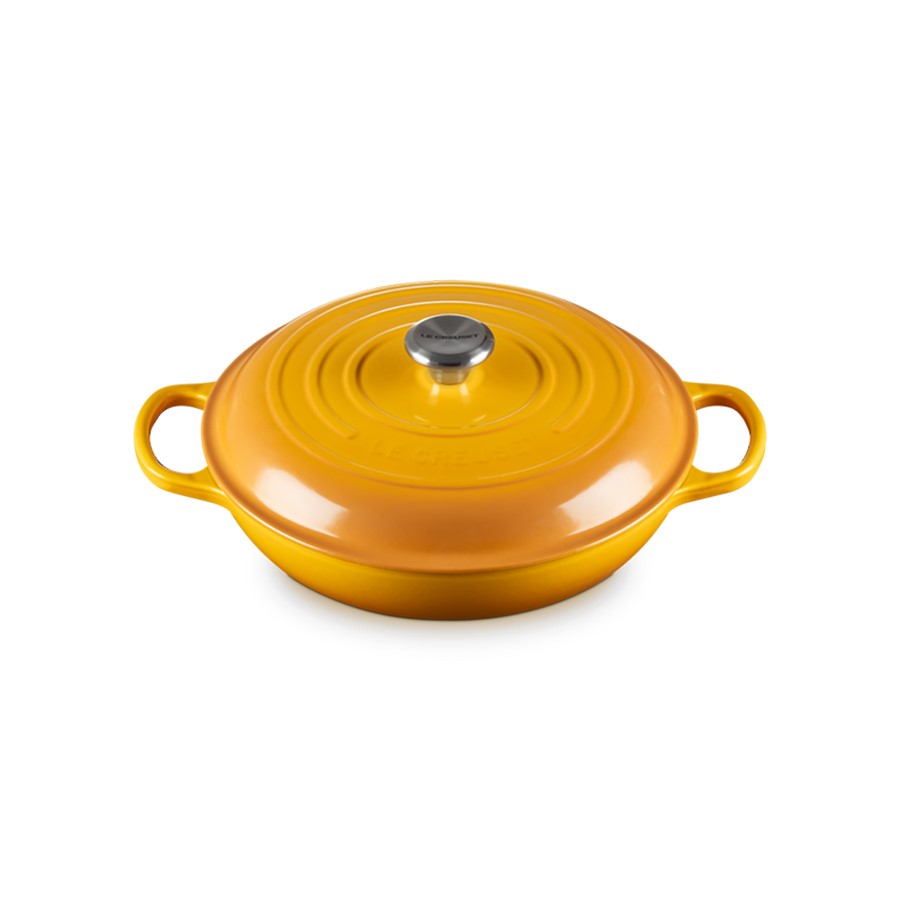 The Le Creuset Shallow Casserole/Braiser in Nectar, 30 cm, blends exceptional craftsmanship with a vibrant and sunny hue. Crafted from durable cast iron, it ensures excellent heat distribution and retention, ideal for braising, sautéing, and shallow frying. The Nectar color adds a cheerful and lively touch to any kitchen, complemented by Le Creuset's renowned enamel finish. Versatile in its use, this shallow casserole dish seamlessly combines practical functionality with aesthetic appeal. Whether for everyday meals or special occasions, it's a must-have piece for chefs and home cooks who value high-quality cookware that enhances both cooking performance and kitchen decor.