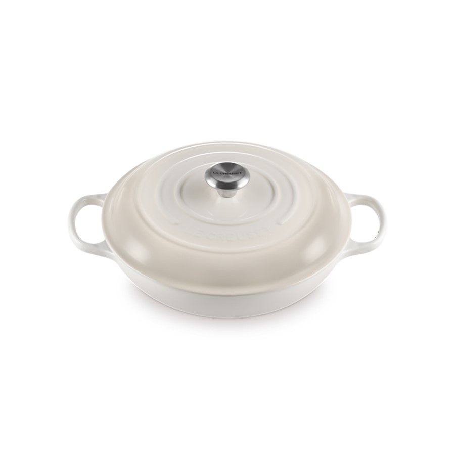 The Le Creuset Shallow Casserole/Braiser in Meringue, 30 cm, combines superior craftsmanship with an elegant and neutral hue. Crafted from durable cast iron, it ensures excellent heat distribution and retention, perfect for braising, sautéing, and shallow frying. The Meringue color adds a sophisticated and timeless touch to any kitchen, complemented by Le Creuset's renowned enamel finish. Versatile in its use, this shallow casserole dish seamlessly blends practical functionality with aesthetic appeal. Whether for everyday meals or special occasions, it's an essential piece for chefs and home cooks who appreciate high-quality cookware that enhances both cooking performance and kitchen decor.