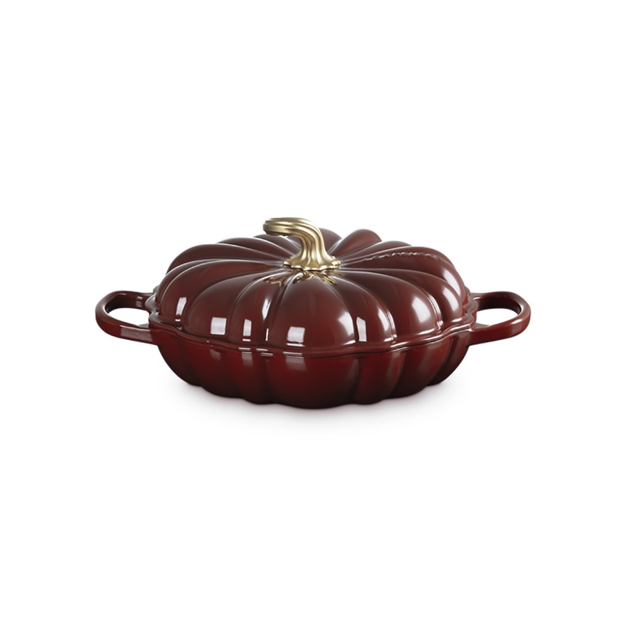 This Le Creuset Pumpkin Braiser is a charming, limited-edition cast iron casserole, designed in the shape of a pumpkin for festive and seasonal cooking. Its shallow design is perfect for roasting, baking, or serving dishes like gratins and casseroles. Crafted from high-quality cast iron, it provides excellent heat retention and even cooking. The enamel coating ensures easy cleaning and prevents sticking. With a vibrant exterior and elegant pumpkin stem handle, this unique piece is both functional and decorative, adding a festive touch to your kitchen and table setting.