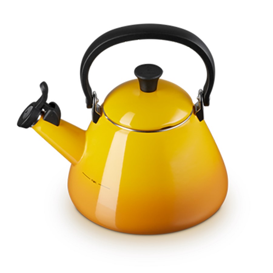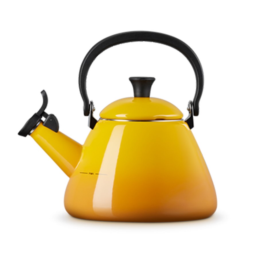 The Le Creuset 1.6L Kone Kettle combines style and functionality in a sleek design. Crafted from premium carbon steel and coated with durable, vibrant enamel, it ensures quick heating and even heat distribution. The fixed whistle alerts when water reaches a boil, while the heat-resistant handle offers safe, comfortable pouring. Suitable for all heat sources, including induction, this kettle adds a touch of elegance to any kitchen. Its compact size is perfect for small spaces, and while dishwasher safe, hand washing is recommended to preserve its finish.