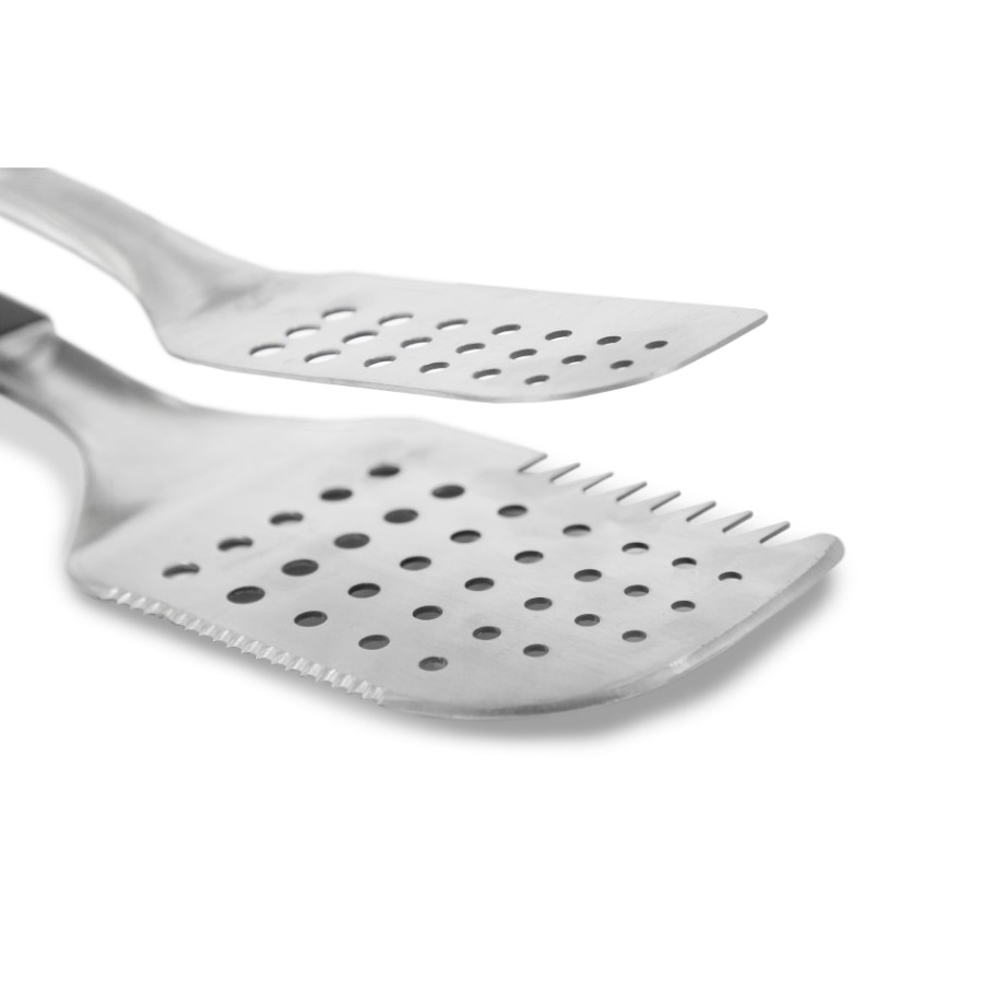 Man the grill with ease using the Pit Boss Soft Touch All-In-One Tool. The innovative design features a stainless-steel spatula and tong combined. Butcher and tenderize meats with the dual-edged spatula. Then, effortlessly grip and flip everything from racks of ribs to whole briskets. The Pit Boss All-In-One Tool comes equipped with an extra-long, heat resistant handle, built-in bottle opener, locking tab, and extra-large hanging loop.