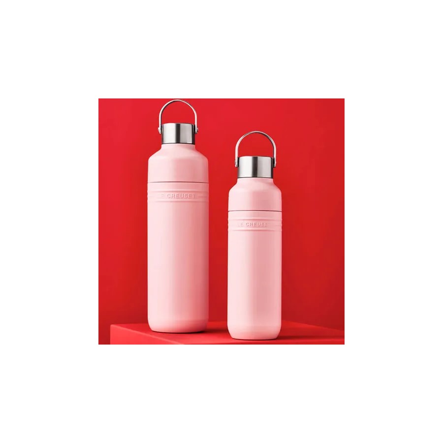 Stay refreshed throughout the day with the Le Creuset On The Go Insulated Water Bottle in Shell Pink. Its double-wall vacuum insulation, featuring a copper layer, ensures your beverages remain hot or cold for hours while preventing exterior condensation.