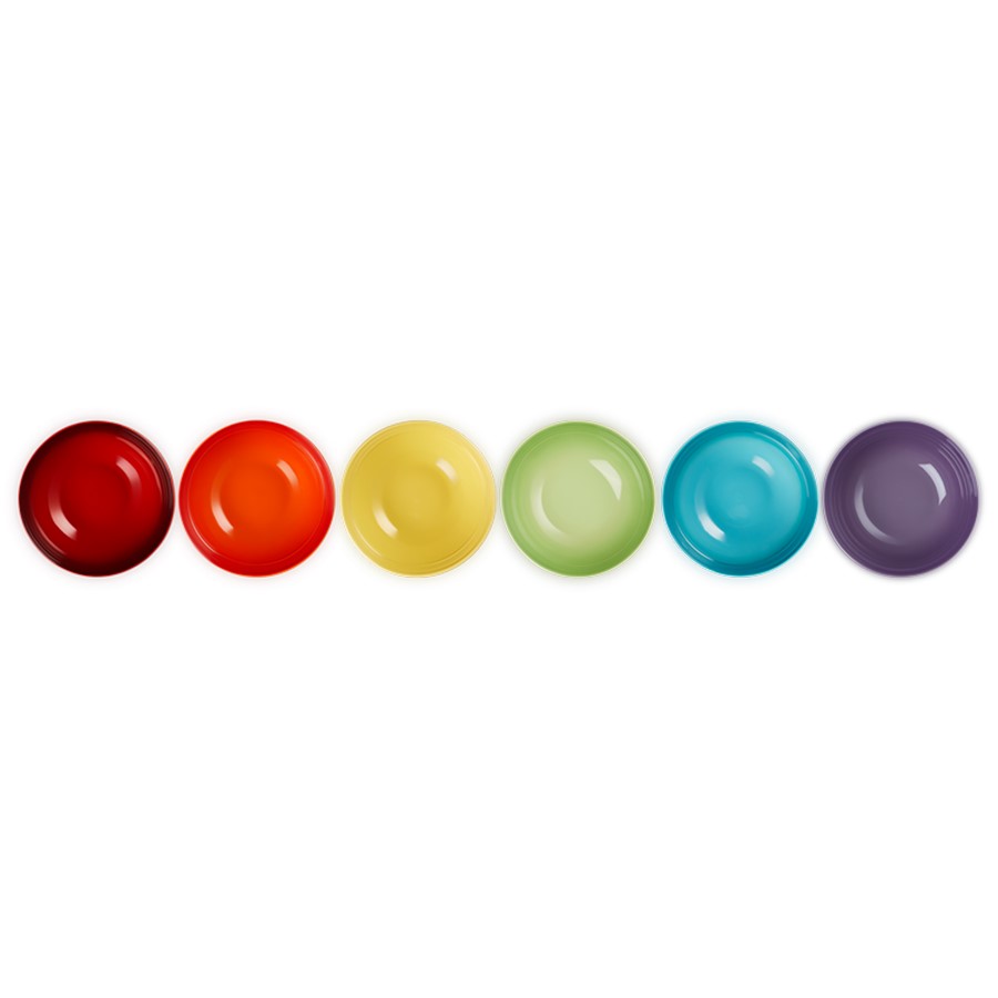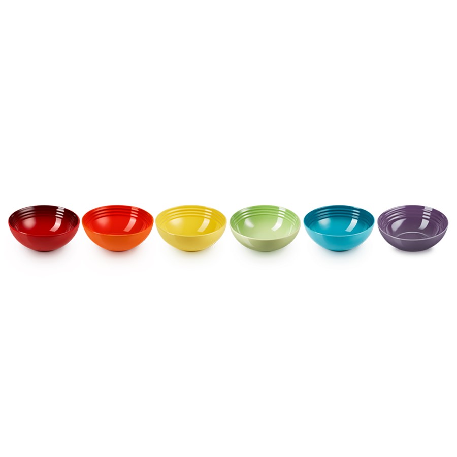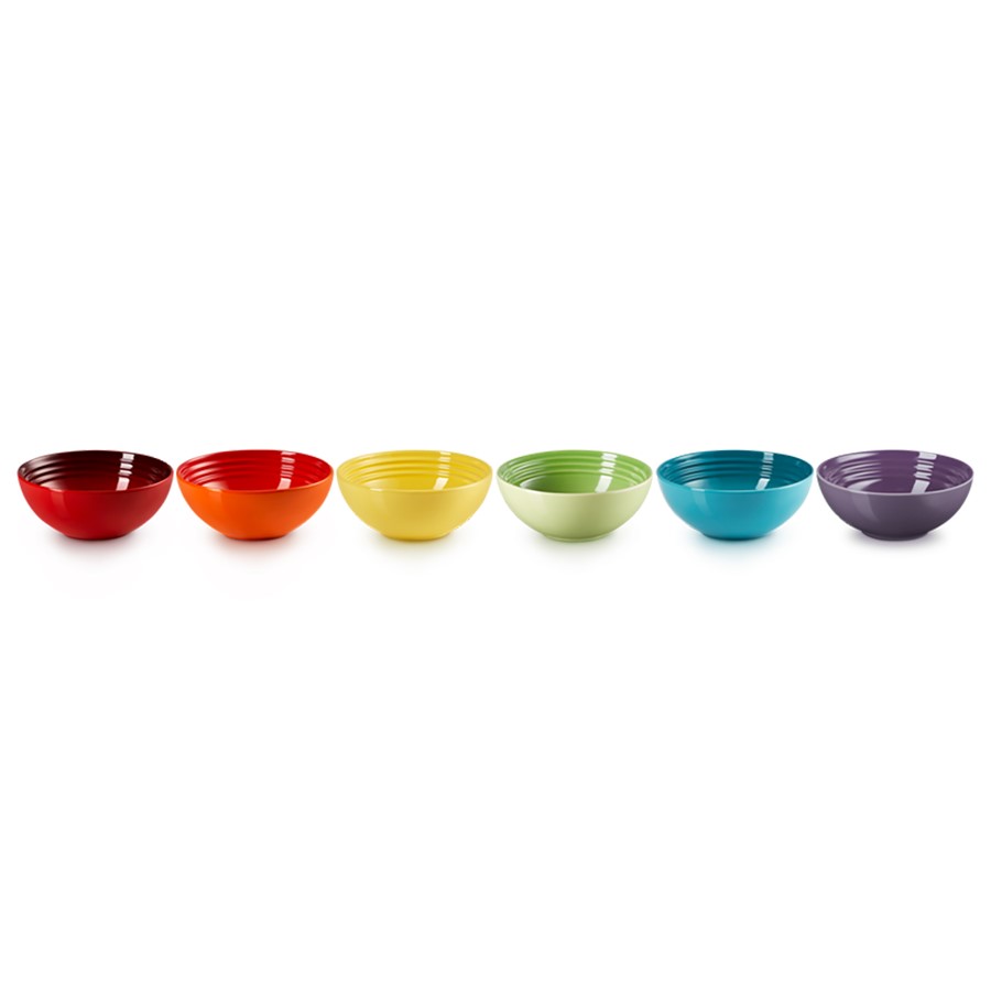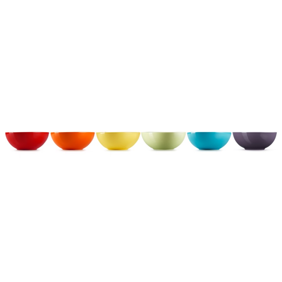 The Le Creuset Stoneware Rainbow Set of 6 Cereal Bowls is a vibrant and durable addition to any kitchen. Crafted from premium stoneware, these bowls feature a colorful assortment of signature Le Creuset hues, adding a cheerful touch to your table setting. Each bowl is designed for everyday use, with a durable glaze that resists chips, scratches, and stains. The stoneware construction ensures excellent heat retention, making them perfect for hot or cold dishes. Dishwasher, microwave, and oven safe, this set combines style, versatility, and durability.