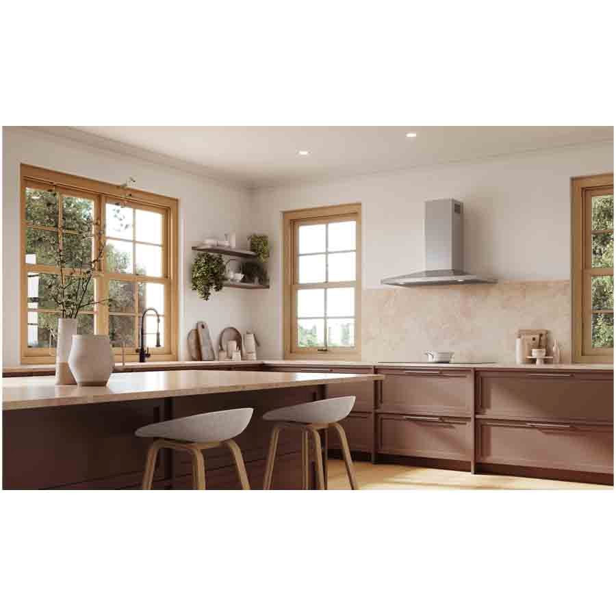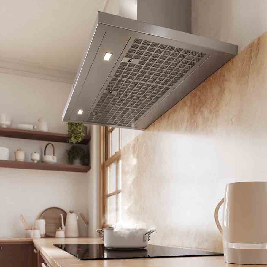 The Falmec Mizar 90 cm wall-mounted hood blends sleek Italian design with serious performance. Crafted entirely from AISI 304 stainless steel in a refined Scotch Brite finish, it features an 800 m³/h motor that effectively removes cooking fumes while maintaining quiet operation at 62 dB.
