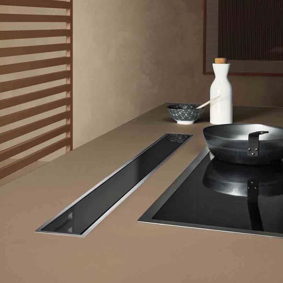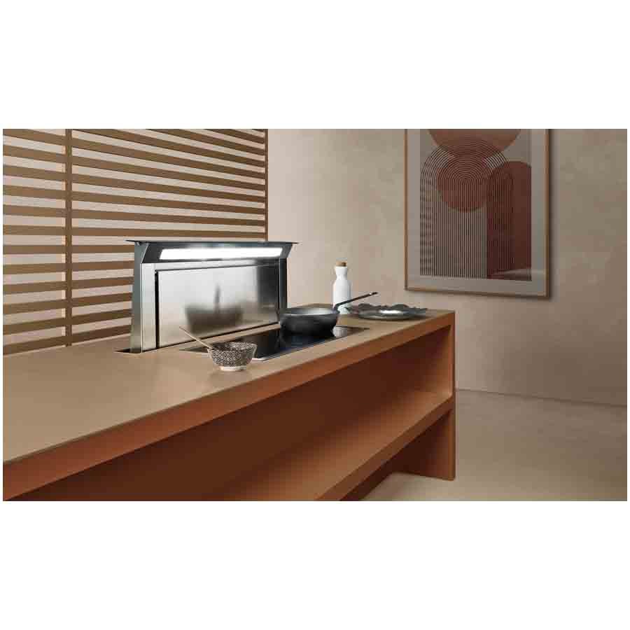 The Falmec Worktop 90 cm Down Draft Extractor transforms seamlessly from sleek stainless-steel countertop strip into a powerful extractor, providing 600 800 m³/h airflow via whisper-quiet perimeter suction.