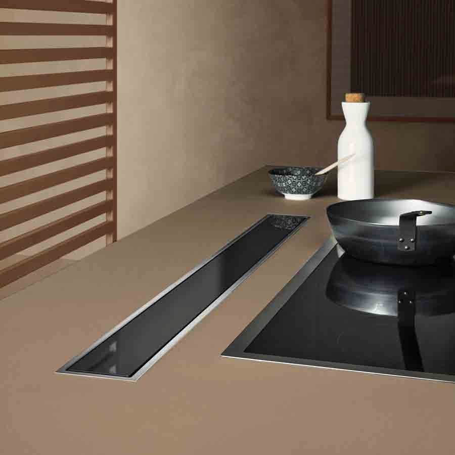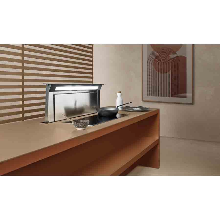 Elevate your kitchen with the Falmec Worktop 90 cm Design + Downdraft Hood in Stainless Steel & Black Glass, a stunning blend of modern design and powerful functionality. Crafted from premium AISI 304 Scotch-brite stainless steel with a sleek black tempered glass top, this downdraft extractor installs discreetly behind the hob and rises only when needed, leaving a seamless black stripe when not in use