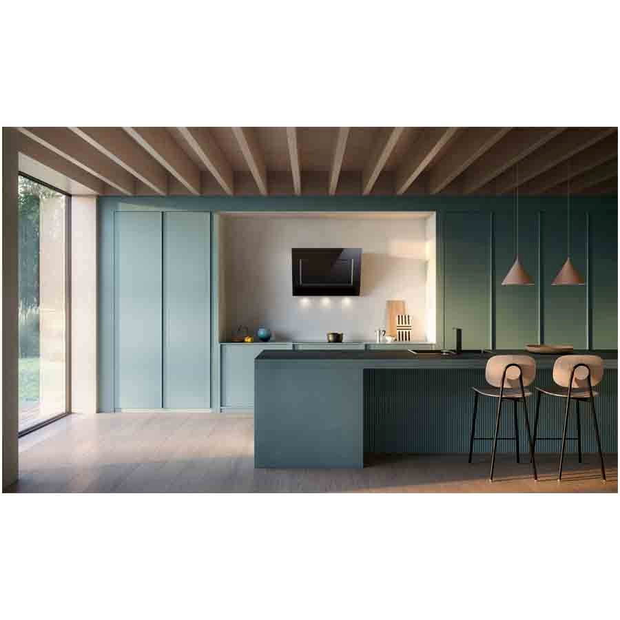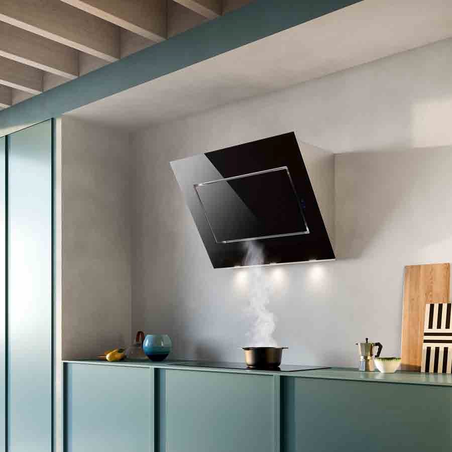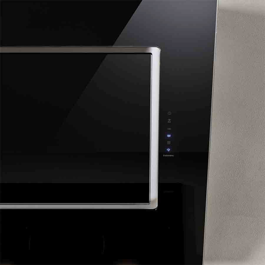The Quasar hood by Falmec is equipped with an inclined glass front panel, proposed here in black, which makes it a modern and elegant piece of furniture. The hood is equipped with a touch button panel serving a powerful 800 m3 / h motor with perimeter suction!