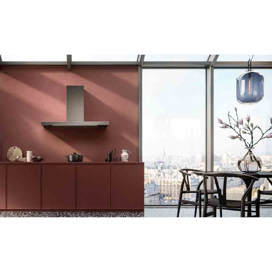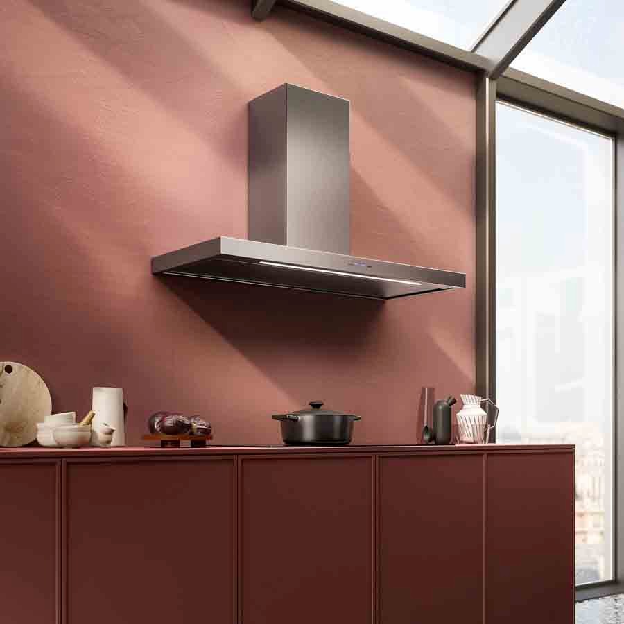 Crafted from premium AISI 304 stainless steel with a Scotch Brite finish, the Falmec Plane Plus 90 cm wall mounted hood combines professional grade performance with minimalist elegance. Its sleek inverted-T form features powerful perimeter suction driven by an 800 m³/h motor (boost to 680 m³/h), ensuring rapid removal of cooking vapors while maintaining quiet operation (around 66-69 dB). Equipped with dynamic, dimmable LED lighting (2 700-5 600 K) for perfect ambiance, an intuitive electronic control panel, and easily removable washable grease filters, it’s designed for effortless use and maintenance. With optional remote control, Carbon Zeo filter compatibility, and Falmec’s Dialogue System for seamless hob to hood integration, this energy efficient Class A appliance is the stylish, smart upgrade your kitchen needs