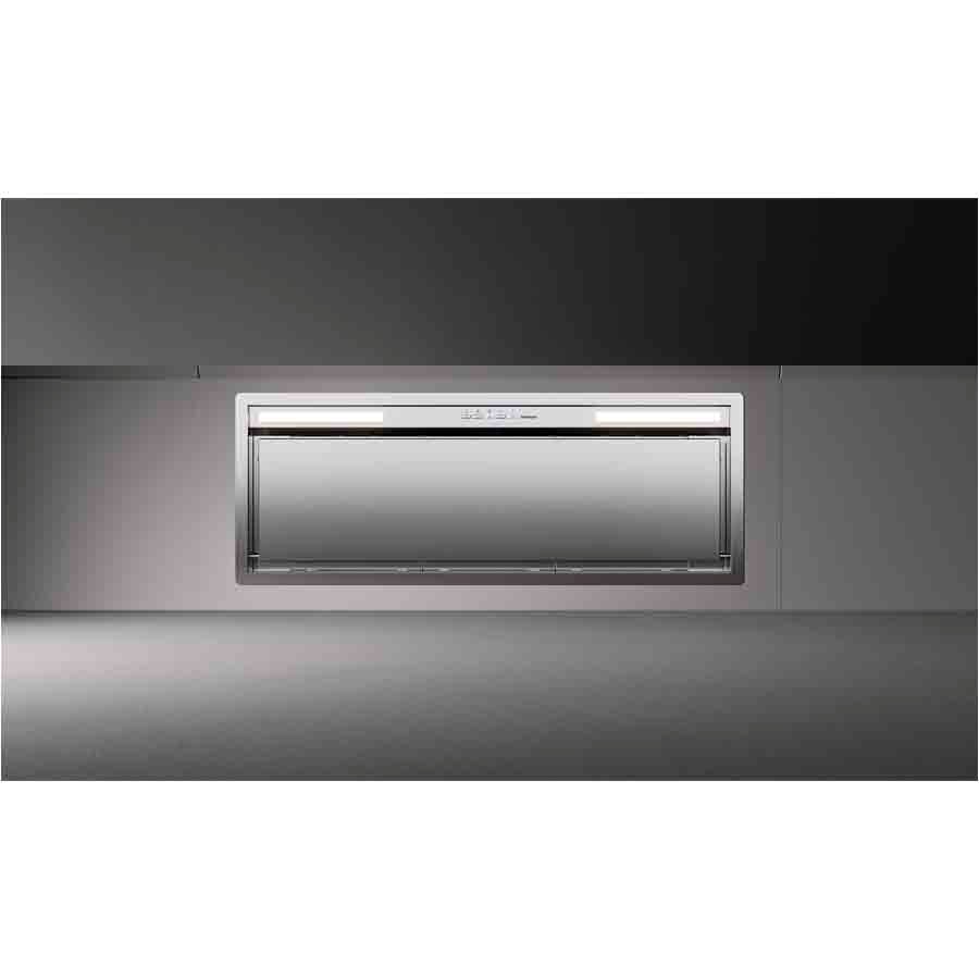 The GRUPPO INCASSO PLUS 50 hood by Falmec is a model fully integrated into the wall unit, shown here with a white lower panel, which reveals a perimeter suction. The hood is equipped with dynamic and dimmable LED lighting and the Dialogue System.