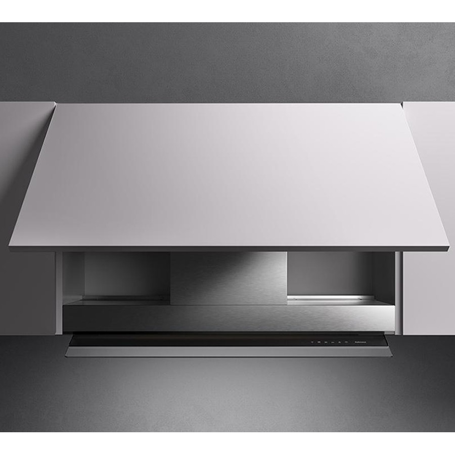 The Falmec Virgola Touch built-in hood offers elegant integration and smart performance for modern kitchens. Hidden inside a wall cabinet, its rotatable smoked glass flap conceals touch controls while protecting cabinetry. Powered by an 800 m³/h motor, it delivers efficient extraction and adjustable-tone LED lighting (2700–5600 K) to illuminate the cooking surface. Features include washable metal grease filters, optional regenerable Carbon.Zeo filtration, and compatibility with No-Drop and NRS quieter versions.