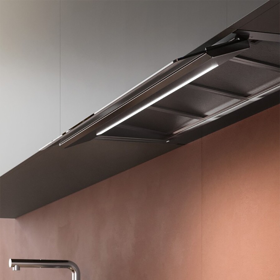 The Falmec Virgola Touch built-in hood offers elegant integration and smart performance for modern kitchens. Hidden inside a wall cabinet, its rotatable smoked glass flap conceals touch controls while protecting cabinetry. Powered by an 800 m³/h motor, it delivers efficient extraction and adjustable-tone LED lighting (2700–5600 K) to illuminate the cooking surface. Features include washable metal grease filters, optional regenerable Carbon.Zeo filtration, and compatibility with No-Drop and NRS quieter versions.