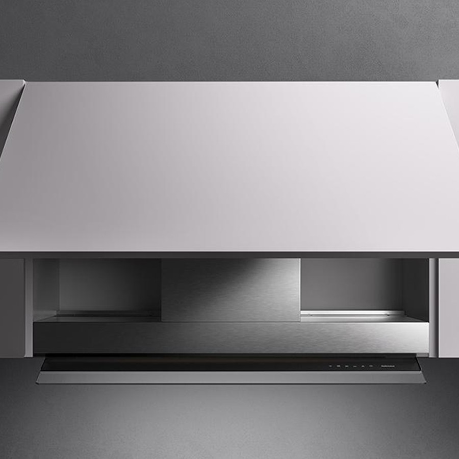 The Falmec Virgola Touch NRS built-in hood offers whisper-quiet yet powerful extraction with its 800 m³/h motor and advanced Noise Reduction System. Its sleek stainless-steel body stays hidden inside a cabinet until the smoked tempered-glass flap is rotated down, revealing touch controls and tone-adjustable LED lighting. Designed for convenience, it features a removable metal grease filter and optional regenerable Carbon.Zeo filtration for fresh, low-maintenance operation. Perfect for modern kitchens that demand both elegance and functionality.