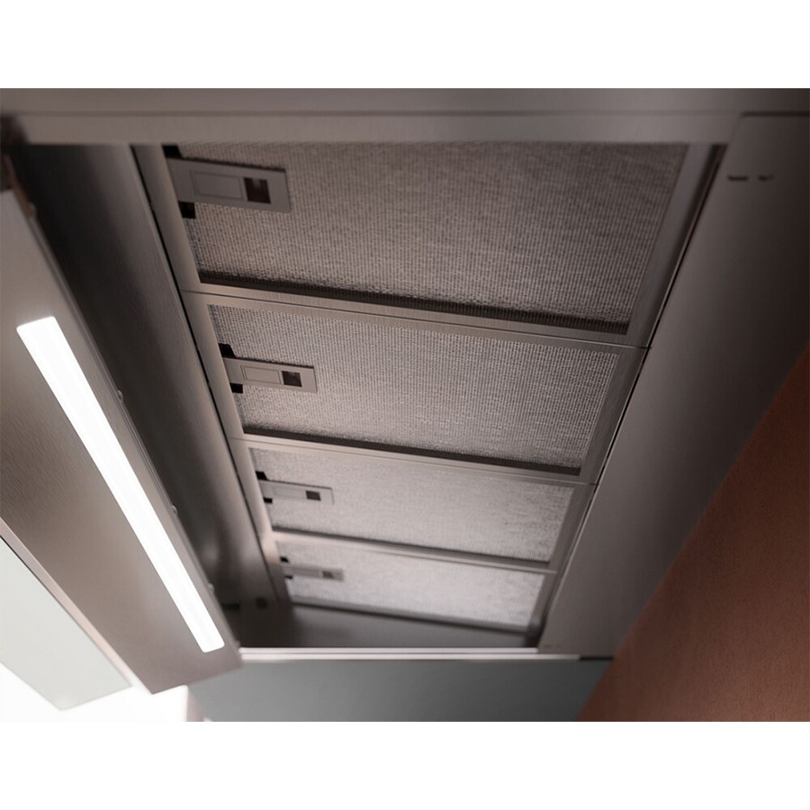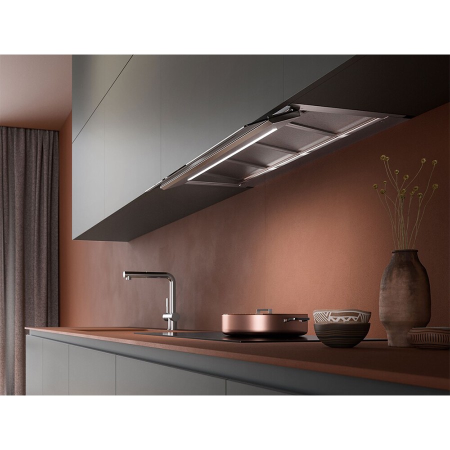 The Falmec Virgola Touch NRS built-in hood offers whisper-quiet yet powerful extraction with its 800 m³/h motor and advanced Noise Reduction System. Its sleek stainless-steel body stays hidden inside a cabinet until the smoked tempered-glass flap is rotated down, revealing touch controls and tone-adjustable LED lighting. Designed for convenience, it features a removable metal grease filter and optional regenerable Carbon.Zeo filtration for fresh, low-maintenance operation. Perfect for modern kitchens that demand both elegance and functionality.