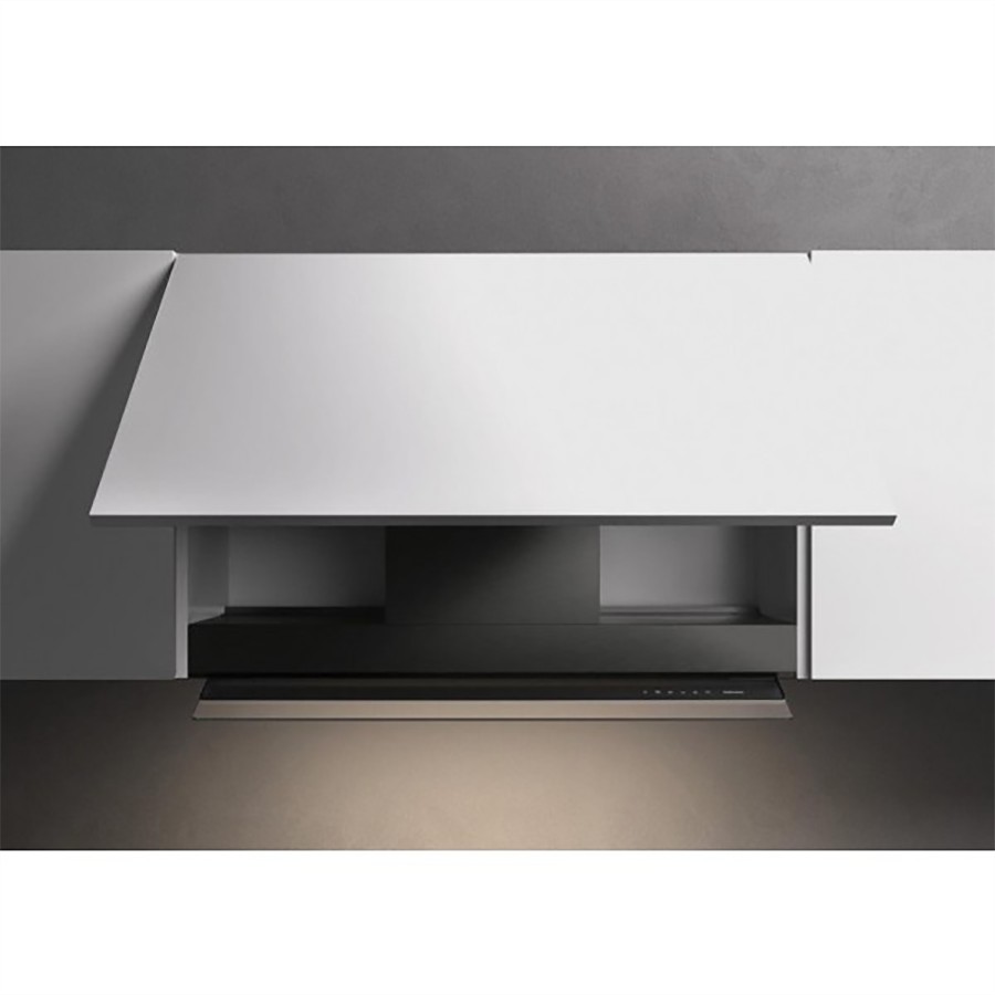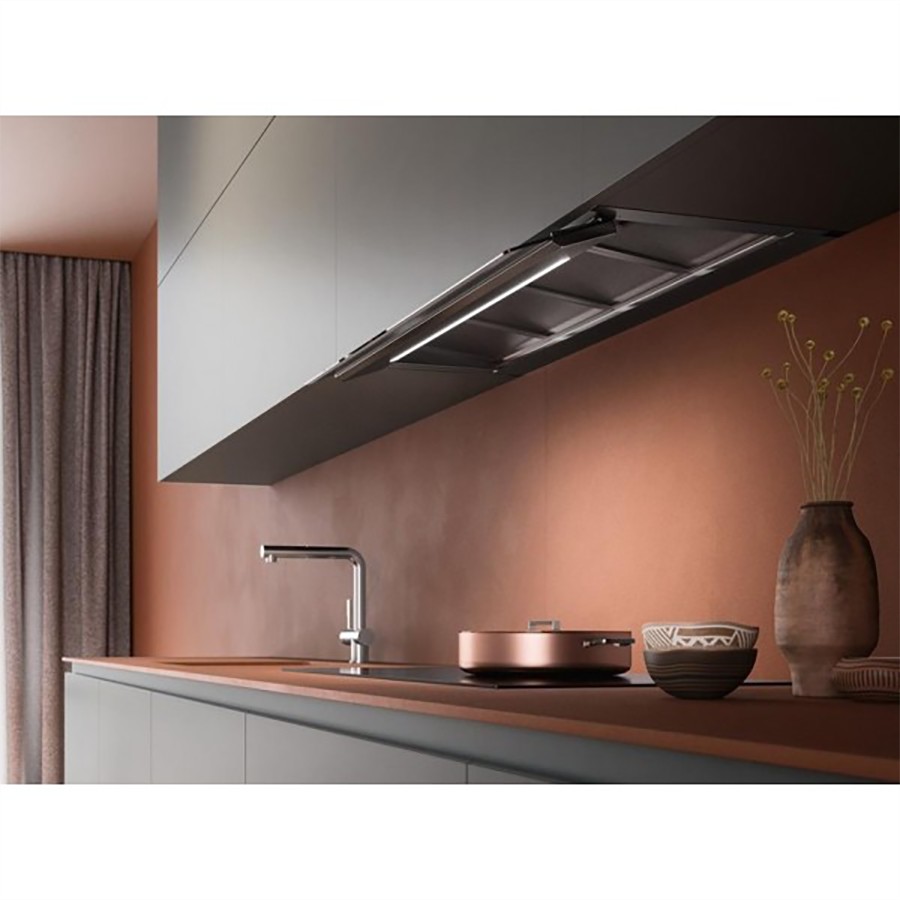 The Falmec Virgola Touch NRS built-in hood offers whisper-quiet yet powerful extraction with its 800 m³/h motor and advanced Noise Reduction System. Its sleek stainless-steel body stays hidden inside a cabinet until the smoked tempered-glass flap is rotated down, revealing touch controls and tone-adjustable LED lighting. Designed for convenience, it features a removable metal grease filter and optional regenerable Carbon.Zeo filtration for fresh, low-maintenance operation. Perfect for modern kitchens that demand both elegance and functionality.