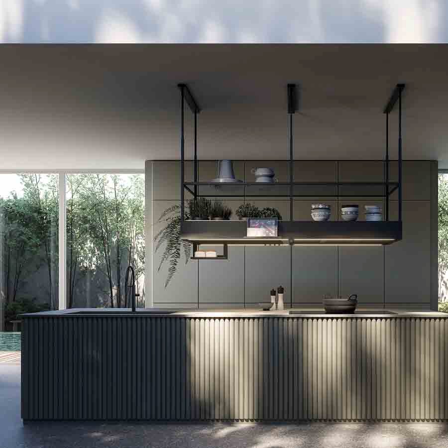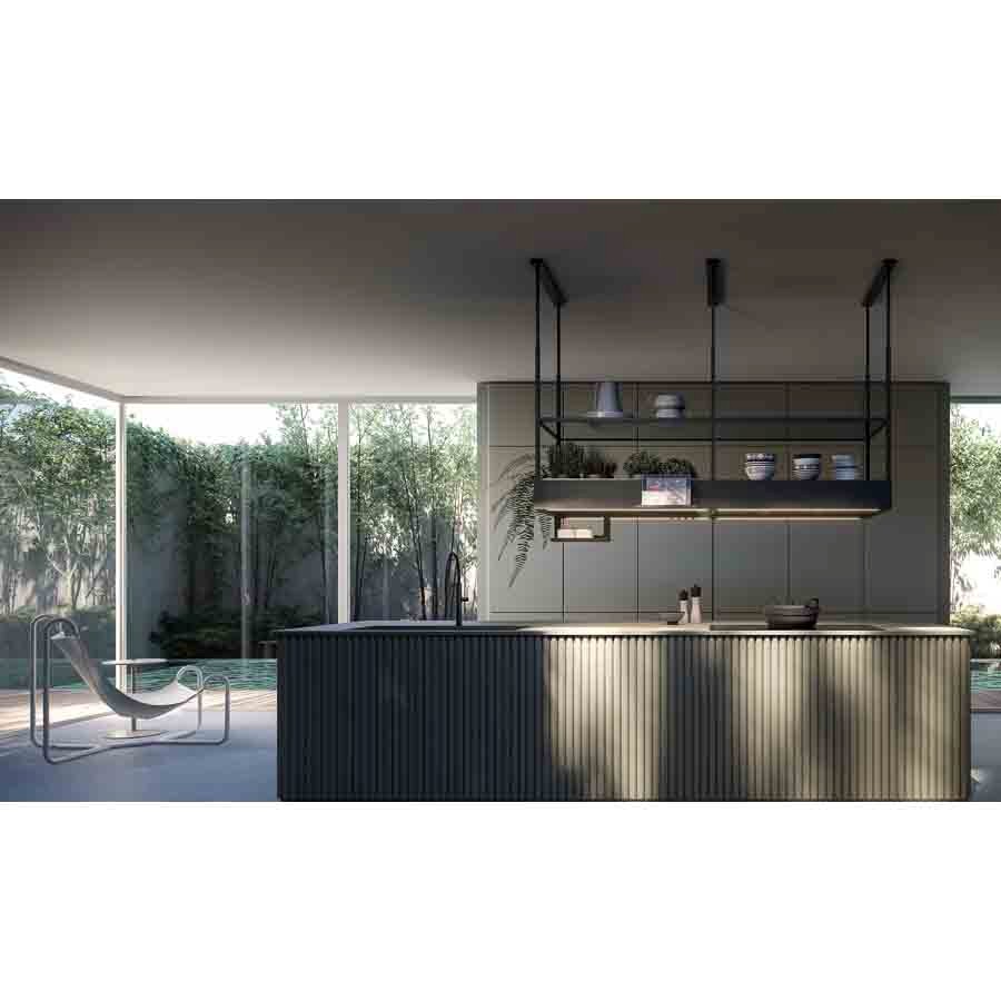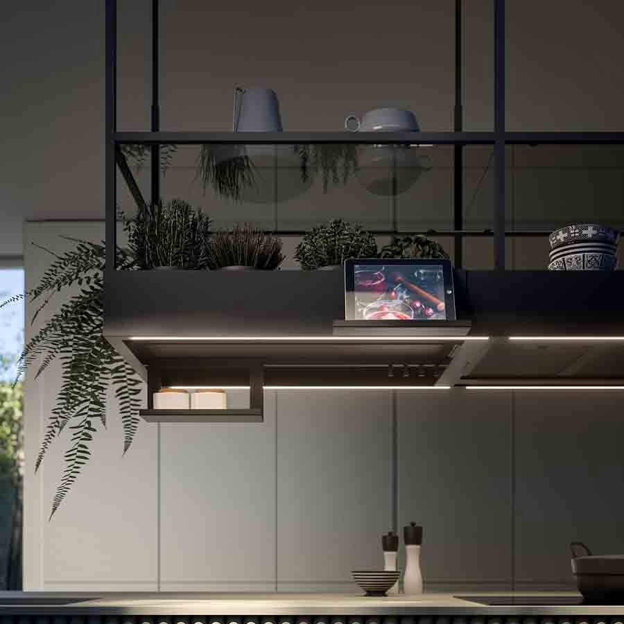 Spazio by Falmec is an innovative filter hood, designed to make the most of space: equipped with smoked glass shelves, hooks, electrical sockets and USB, Spazio overcomes the traditional concept of hood becoming a real furnishing accessory for your kitchen