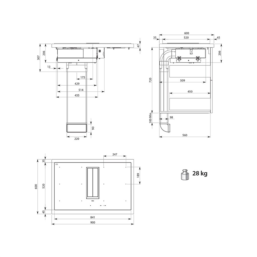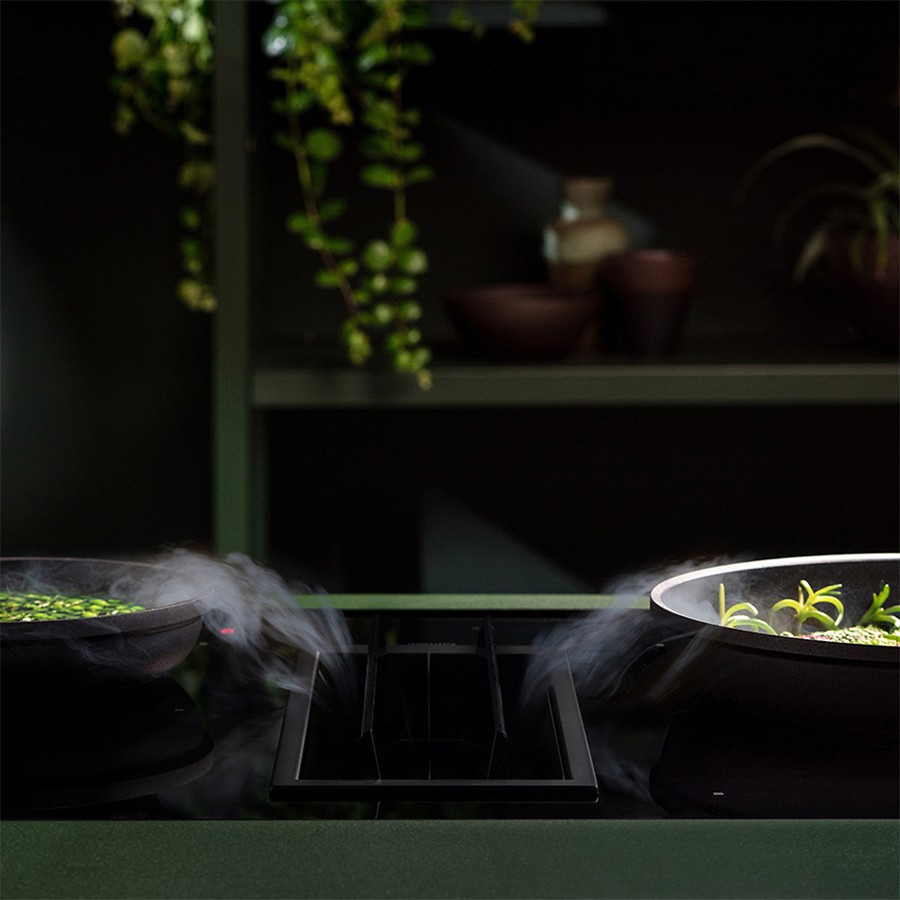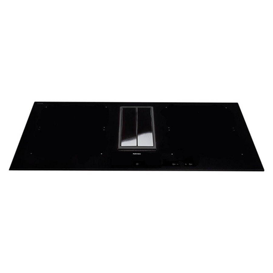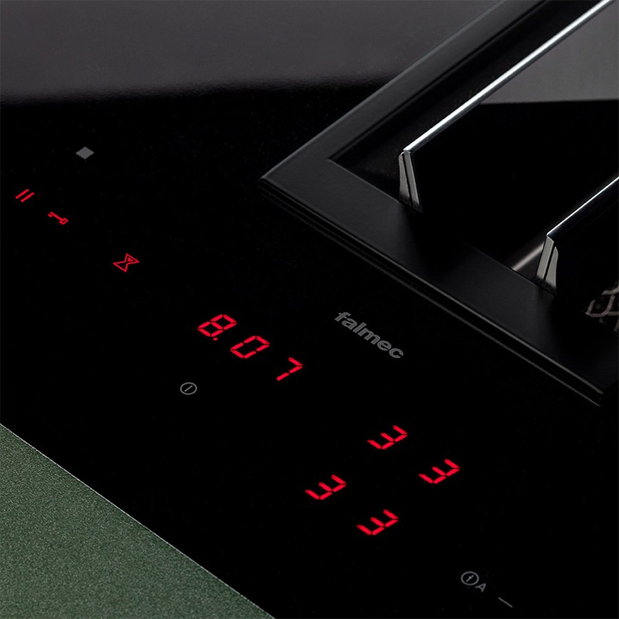 The Falmec Quantum Pro induction hob with built-in extractor is a refined all-in-one cooking system featuring a sleek black glass ceramic surface and a hidden central extraction unit with motorized glass flaps that open automatically when in use. Precision touch slider controls with display offer nine power levels plus Boost, pot detection, individual timers, Keep Warm and pause modes all backed by a powerful brushless motor. In the optional Easy model, integrated Carbon.Zeo filtration removes odours and moisture, eliminating the need for ducting. Minimalist elegance meets high performance for a truly modern kitchen centerpiece.