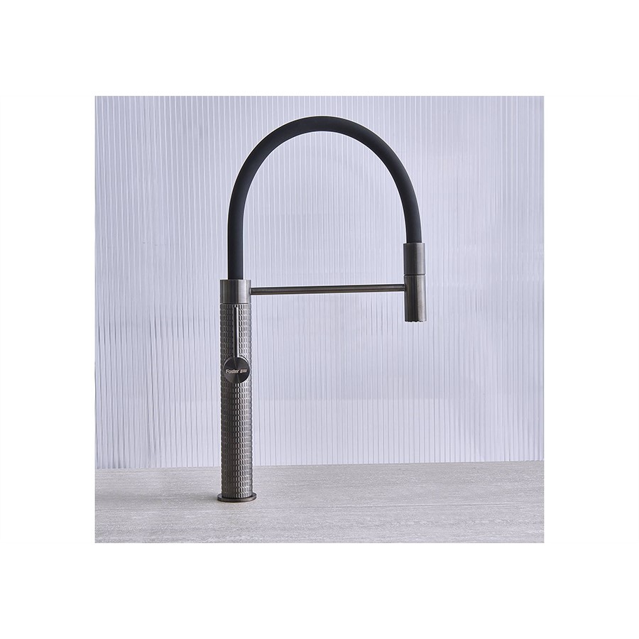 The Foster Mixer Tap Omega Plus Gun Metal is a stylish and functional addition to any modern kitchen. It features an extractable shower head, offering enhanced flexibility for rinsing dishes, washing vegetables, and filling pots. With a rotating angle that provides a full range of motion, it ensures easy water flow control, especially in larger sinks. The included strengthening plate adds stability during installation, preventing wobbling over time, particularly on thinner countertops. The gun metal finish not only enhances its sleek design but also offers durability and resistance to wear, making it a reliable, long-lasting kitchen tap.