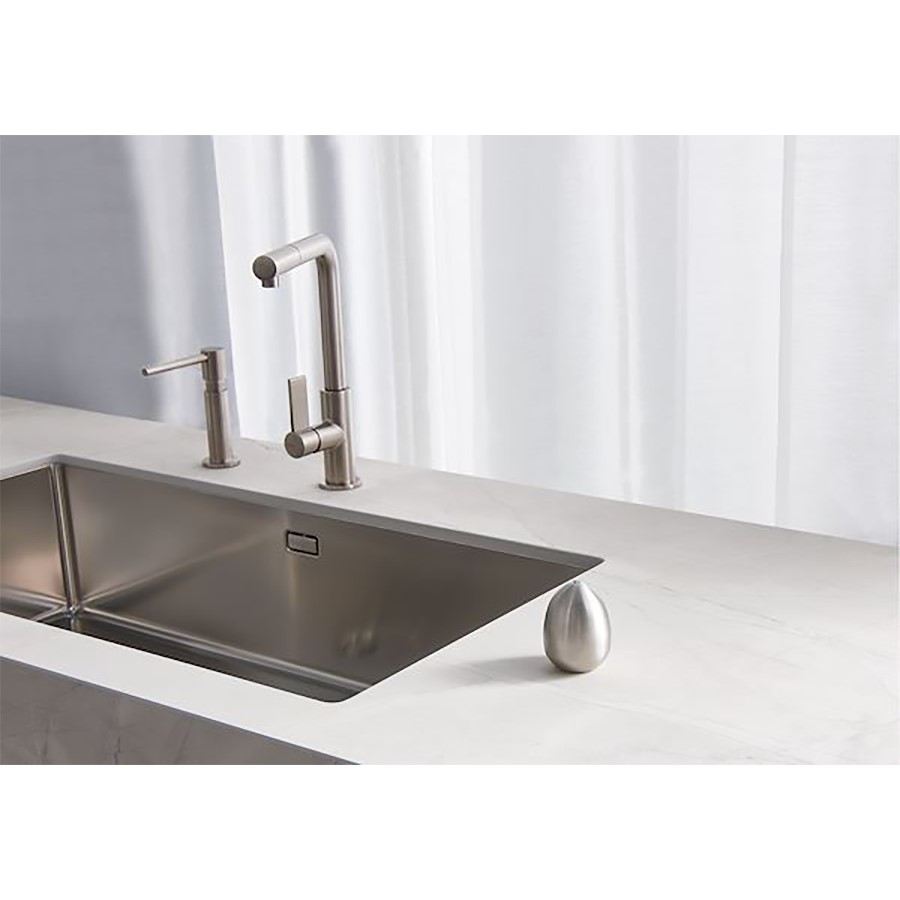With an extractable shower head and a rotating spout, the Vela Plus offers flexibility and convenience, perfect for larger sinks or double-basin setups. It also includes a strengthening plate for added stability during installation. Stylish and durable, this tap is ideal for any contemporary kitchen.