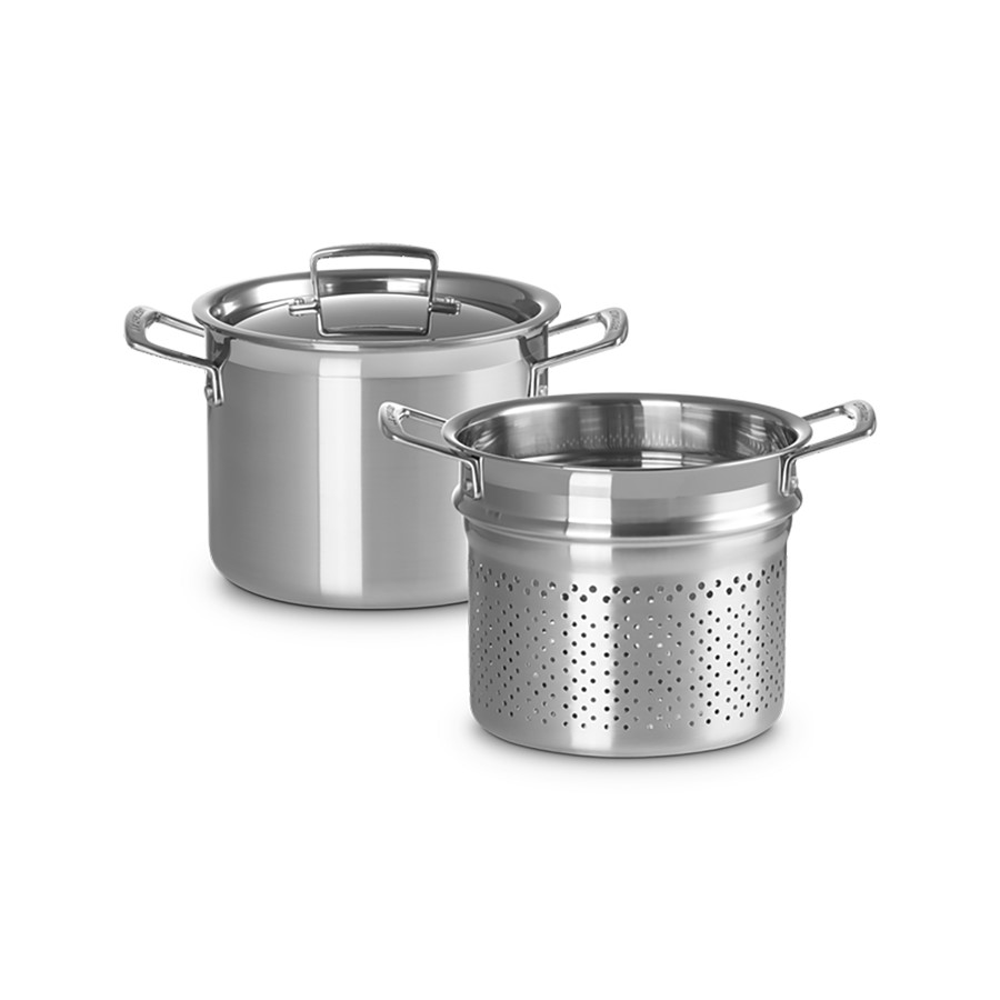 The Le Creuset Stainless Steel Pasta Pot is a must-have for any pasta lover. Crafted from high-quality stainless steel, it offers excellent heat conduction for perfectly cooked pasta every time. The pot features a spacious design with a fitted lid, making it ideal for boiling large quantities. Its integrated straining lid allows for easy draining without the need for a separate colander, adding convenience to your cooking routine. The polished stainless steel finish is both durable and elegant, complementing any kitchen decor. Easy to clean and compatible with all stovetops, this pasta pot is perfect for home cooks and culinary enthusiasts alike.