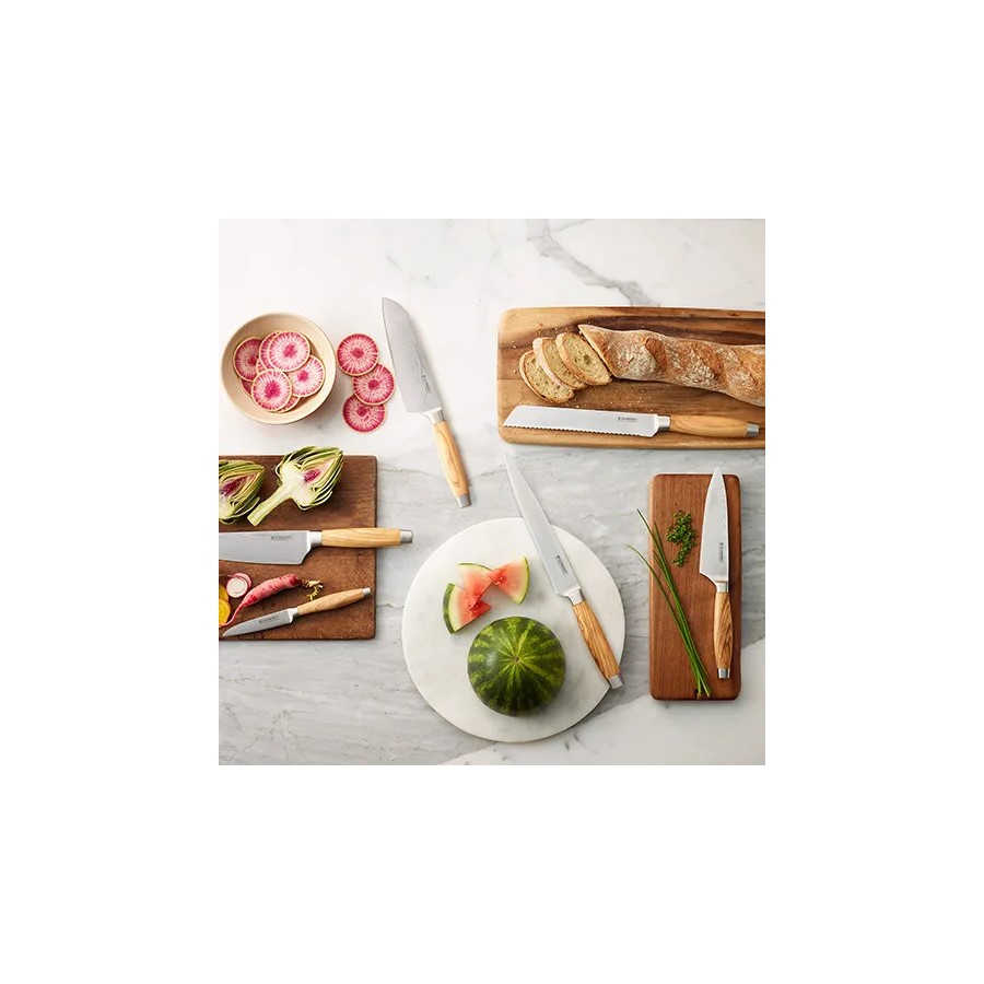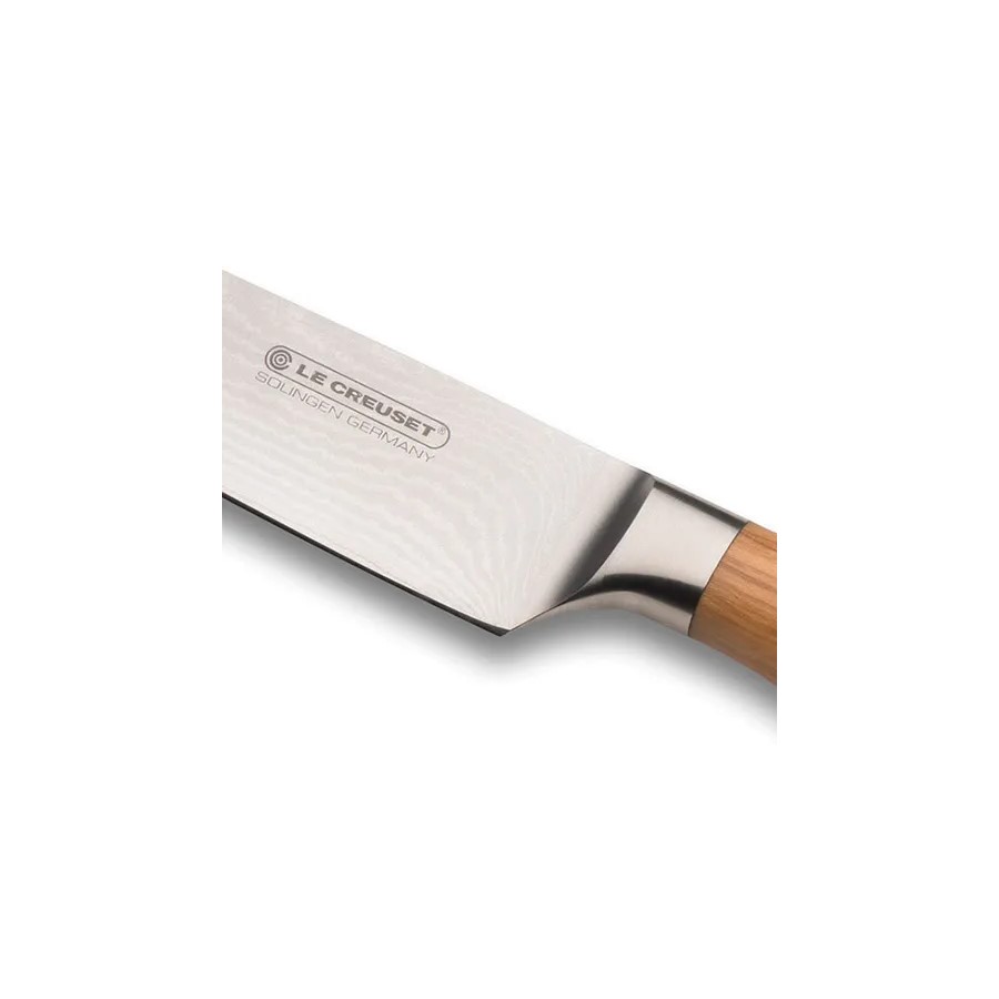The Le Creuset Santoku Knife 13 cm with an olive wood handle is a versatile kitchen tool, ideal for slicing, dicing, and chopping vegetables, fruits, and meats. Crafted with a high-quality Damascus steel blade featuring a VG-10 core, it offers exceptional sharpness and durability. The ergonomic Italian olive wood handle provides a comfortable and secure grip, ensuring precise control during use. Forged in Solingen, Germany, the knife boasts a Rockwell hardness of 61, guaranteeing long-lasting performance. Hand washing is recommended to maintain its quality.