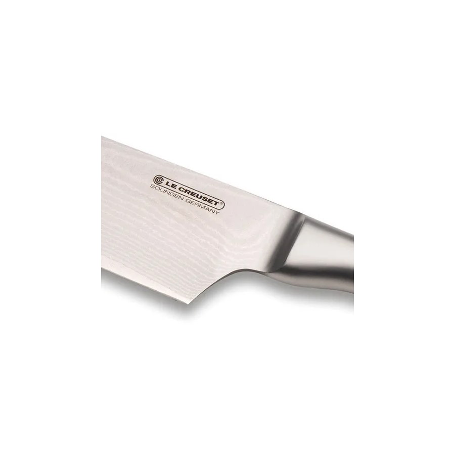 The Le Creuset Santoku Knife (18 cm) is a versatile kitchen tool designed for precision slicing, dicing, and mincing. Crafted with a high-quality Damascus steel blade featuring a VG-10 core, it offers exceptional sharpness and durability. The ergonomic stainless steel handle ensures a comfortable grip, allowing for controlled and safe use. This knife is perfect for preparing vegetables, fruits, meat, and fish, making it an essential addition to any kitchen. It is recommended to hand wash the knife and use appropriate sharpeners to maintain its edge.