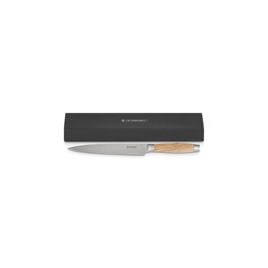 The Le Creuset Carving Knife 20 cm with an olive wood handle is a precision tool designed for effortless slicing of meats, poultry, and fish. Crafted with a 64-layer Damascus steel blade featuring a VG-10 core, it offers exceptional sharpness and durability. The ergonomic Italian olive wood handle provides a comfortable and secure grip, ensuring precise control during use. Forged in Solingen, Germany, the knife boasts a Rockwell hardness of 61, guaranteeing long-lasting performance. Hand washing is recommended to maintain its quality.