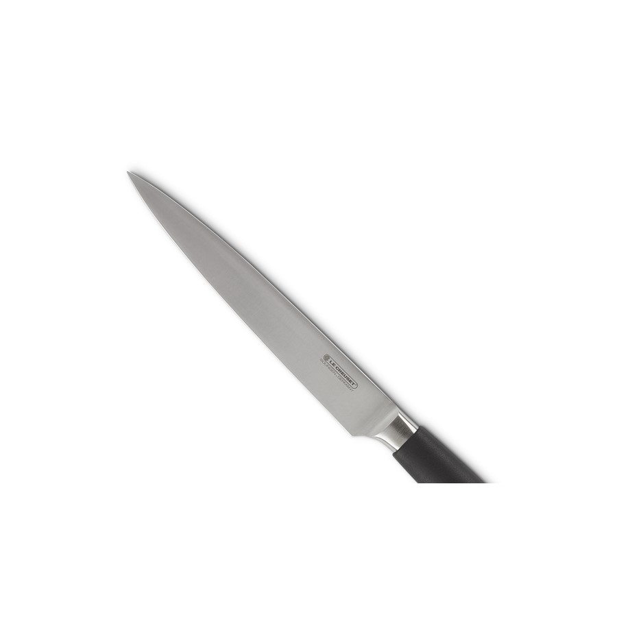 Featuring a long and narrow blade, the Le Creuset 20cm Carving Knife With Plastic Phenolic Handle slices effortlessly through meat, poultry and fish - without tearing the flesh. This carving knife has a taper-ground and high-carbon stainless steel blade that is strong, sharp and the bolster provides extra strength and perfect balance. Complete with a sure-grip, black phenolic handle, which is both safe and comfortable to hold.