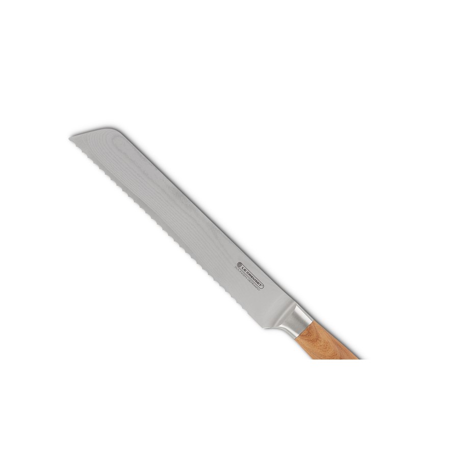 The Le Creuset Bread Knife 20 cm with an olive wood handle is designed for effortless slicing of crusty breads, cakes, and roasted meats. Its serrated edge allows for clean cuts through tough exteriors without crushing delicate interiors. The knife features a 64-layer Damascus steel blade with a VG-10 core, providing exceptional sharpness and durability. The ergonomic Italian olive wood handle offers a comfortable and secure grip, ensuring precise control during use. Forged in Solingen, Germany, the knife boasts a Rockwell hardness of 61, guaranteeing long-lasting performance. Hand washing is recommended to maintain its quality.