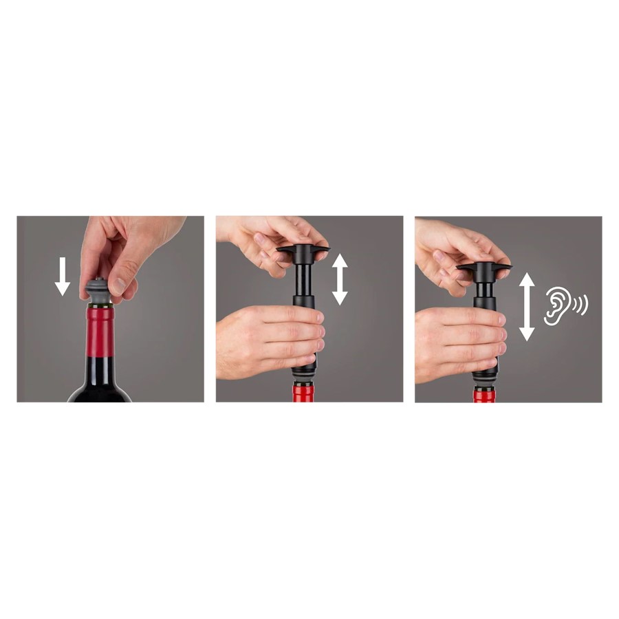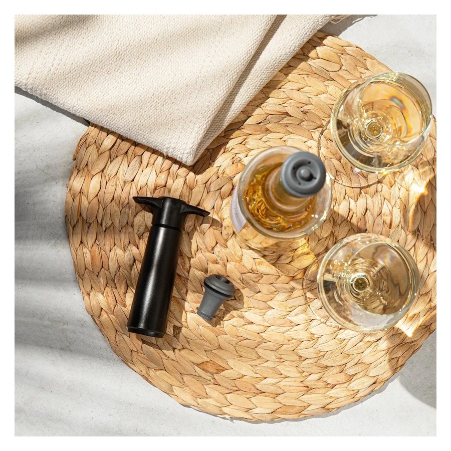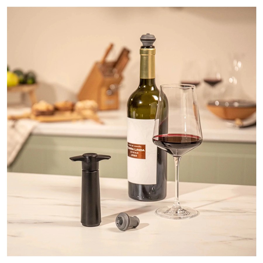 The Vacu Vin Wine Saver Concerto is a premium wine preservation set designed to keep your wine fresh for up to 10 days. This set includes a vacuum pump, two reusable stoppers, and a crystal wine server. The vacuum pump creates an airtight seal by removing air from the bottle, while the stoppers ensure no air enters, preserving the wine's flavor and aroma. The crystal wine server allows for drip-free pouring, adding elegance to your wine experience. All components are dishwasher safe for easy cleaning