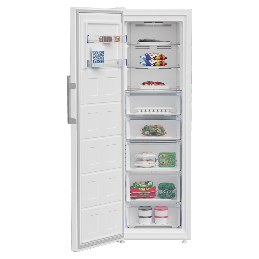 A tall larder freezer designed to provide ample frozen food storage with a modern, sleek white finish. It features a 286-liter capacity, making it ideal for large households. Equipped with NoFrost technology, it prevents ice build-up, eliminating the need for manual defrosting. The freezer includes five spacious, transparent drawers for easy organization and visibility of contents. With an E energy rating, it offers efficient performance while keeping energy consumption in check. The reversible door design allows flexible installation, adapting to various kitchen layouts.