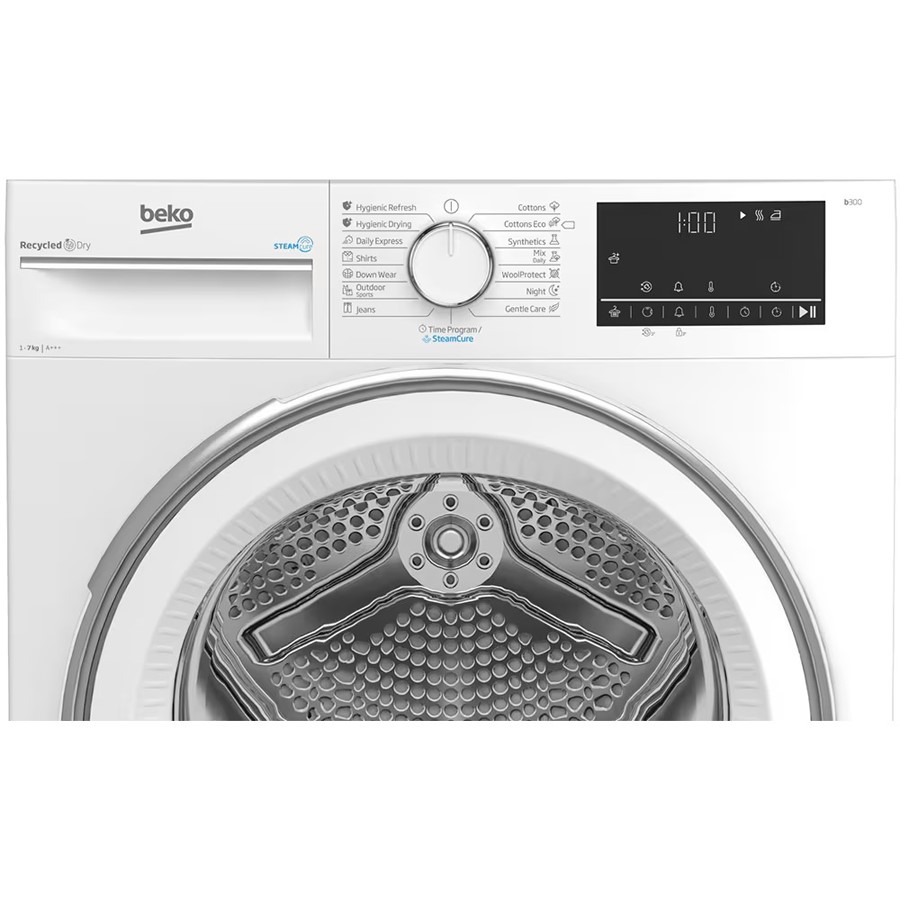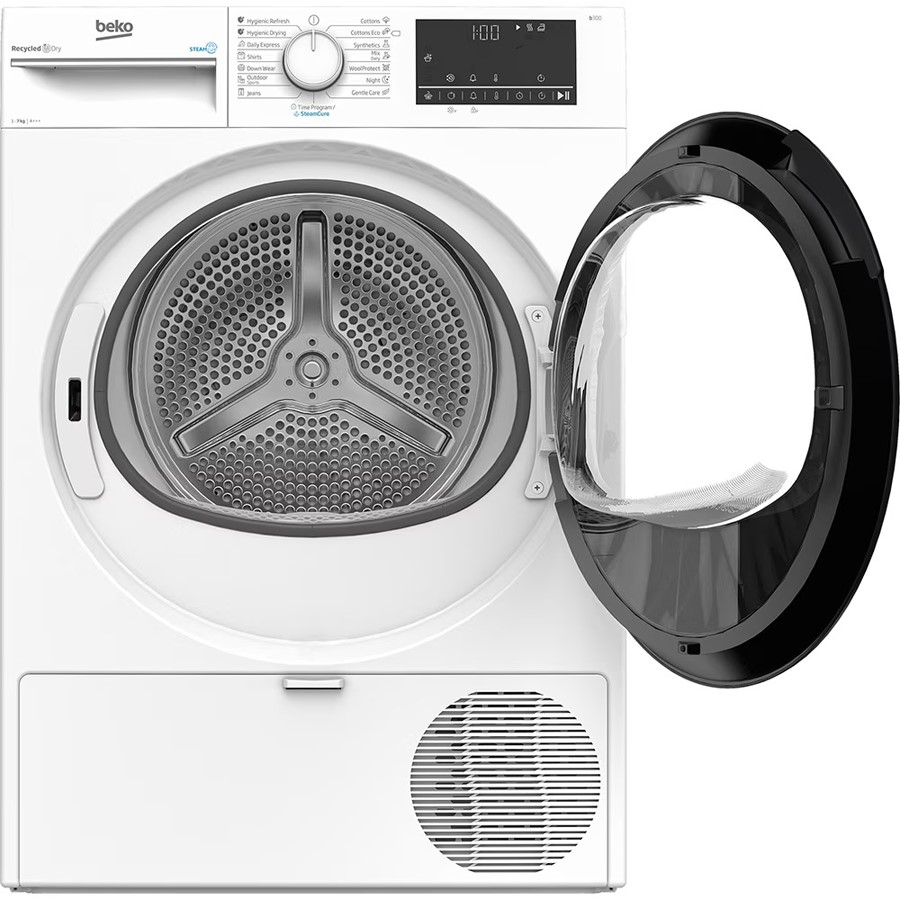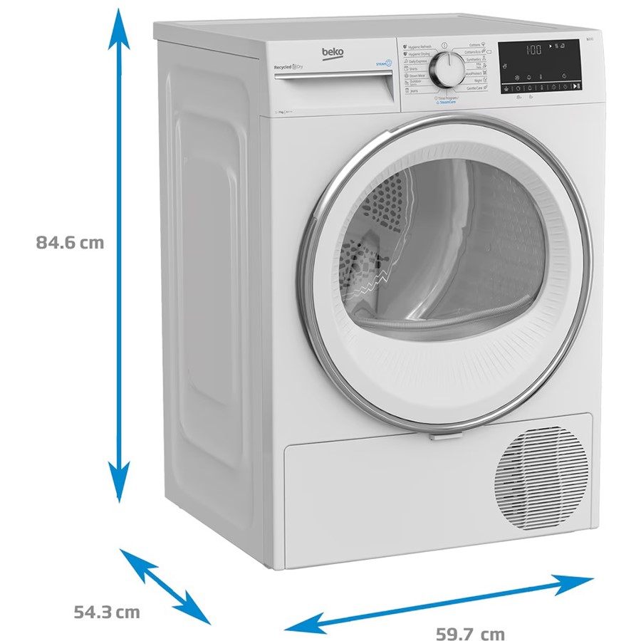 Elevate your laundry routine with the Beko B3T41242 heat pump tumble dryer, offering a 7 kg capacity ideal for medium-sized households. Its ProSmart™ Inverter motor ensures energy efficiency, reduced noise levels, and enhanced durability. The EcoGentle™ technology preserves the vibrancy of your garments by providing gentle drying without color fading. Featuring 15 specialized programs, including settings for jeans, wool, and outdoor wear, it caters to diverse fabric needs. The AquaWave® system's wave-like drum action treats clothes with care, minimizing wear and tear. With a sleek white design and user-friendly digital display, this dryer seamlessly combines functionality with modern aesthetics.
