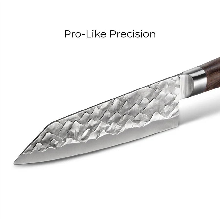 Achieve a pro-like slice. This Santoku knife features a short blade and straight cutting profile, making tasks like slicing fine fish and vegetables effortless.