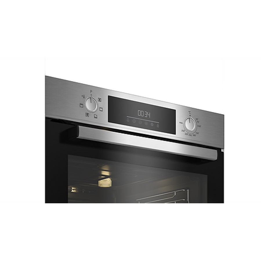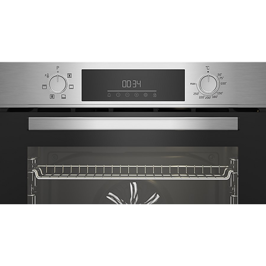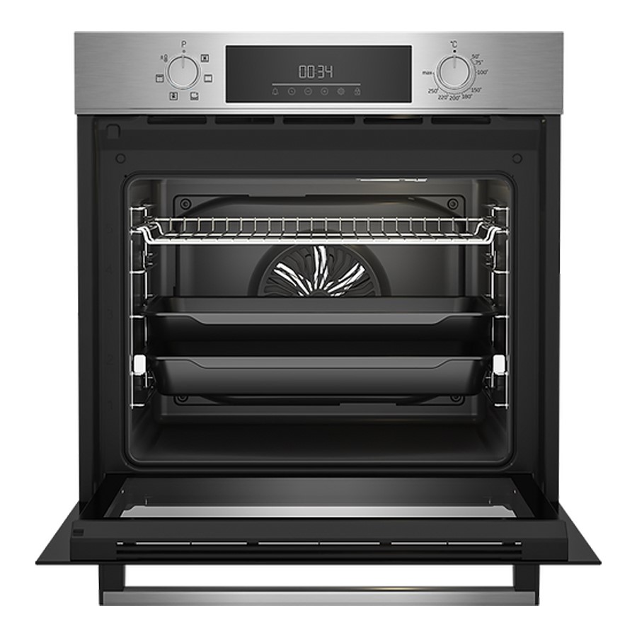 This fan-assisted oven is designed to combine modern aesthetics with efficient performance. It features a sleek stainless-steel finish, adding a contemporary touch to any kitchen. This model offers a generous oven capacity, suitable for family meals, and comes equipped with several cooking functions, including fan-assisted cooking, grilling, and defrosting, providing versatility for a range of recipes. The oven also includes easy-to-use controls, energy-efficient operation, and a clear glass door, allowing users to monitor their cooking with ease.