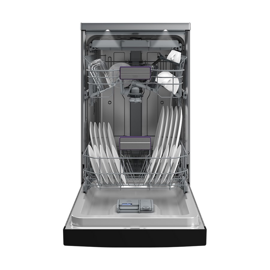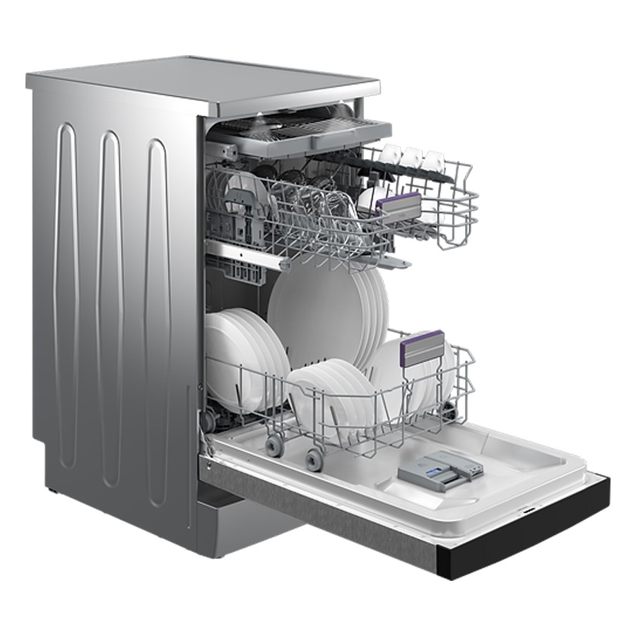 This slimline freestanding dishwasher is perfect for compact kitchens, offering the capacity to handle up to 11 place settings. Its versatile wash programs cater to a range of dishwashing needs, from delicate items to heavily soiled pots. Featuring a sleek stainless steel finish, it adds a contemporary touch to your kitchen. The adjustable racks maximize space efficiency, and its energy-efficient design ensures thorough cleaning while minimizing power consumption. With a quiet operation, this dishwasher provides a practical, stylish, and effective solution for smaller households.