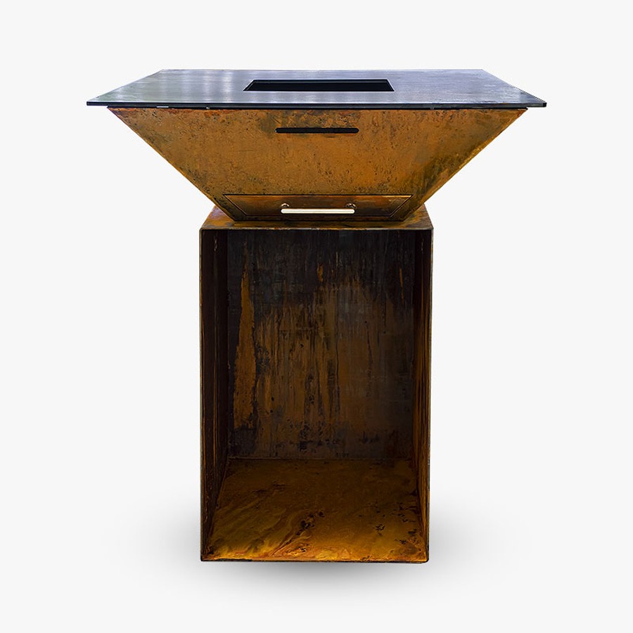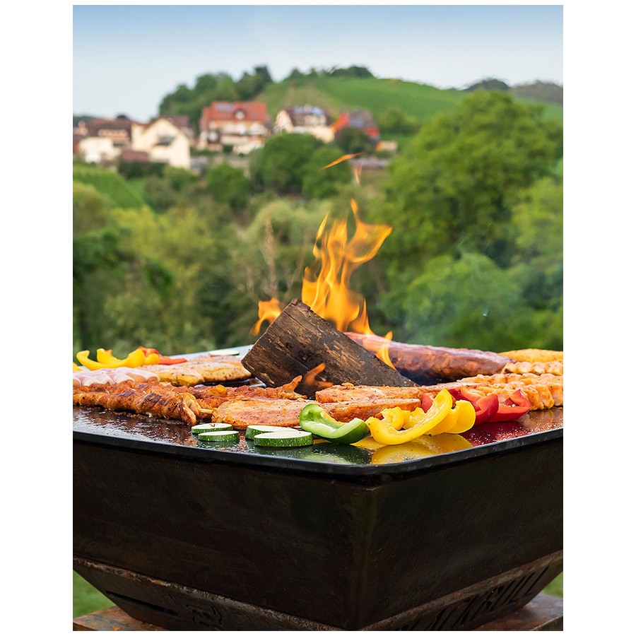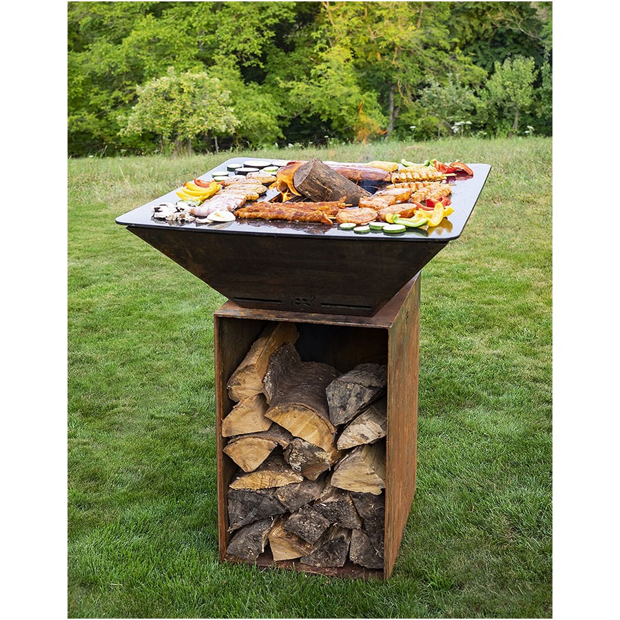 Elevate your outdoor cooking experience with the BigQube M Wood Corten fire plate grill. Crafted from durable Corten steel, this grill boasts an 80×80 cm cooking surface and a 30×30 cm central recess, offering ample space for diverse culinary creations. The 0.8 cm thick grill plate ensures even heat distribution, while its inward slope prevents grease from dripping, maintaining a clean cooking area. Standing at a comfortable 99 cm working height, the open base design provides practical storage space