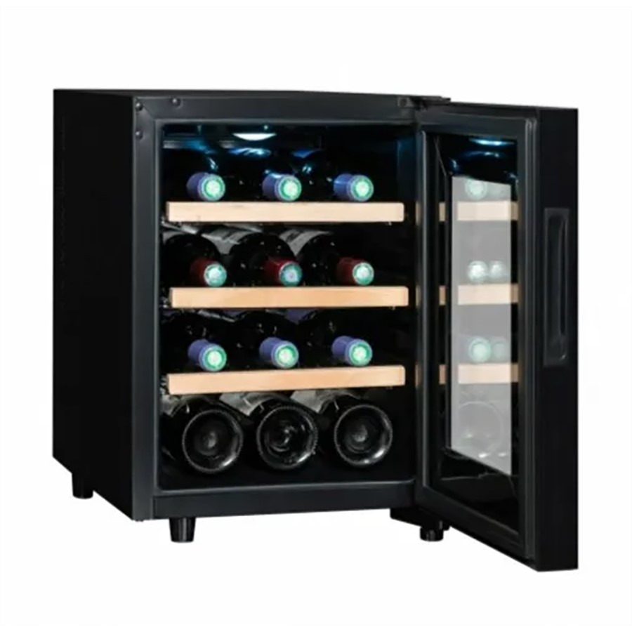 The Climadiff CC12 is a sleek hybrid single-zone wine cellar with a 12-bottle capacity and ultra-quiet operation at just 26 decibels. It features a stylish black design, triple-glazed glass door, and natural wood shelf fronts. The white LED lighting and integrated handle add to its modern look, while the touch control panel allows easy adjustments without opening the door. Ideal for storing wine at a consistent temperature between 11°C and 18°C.