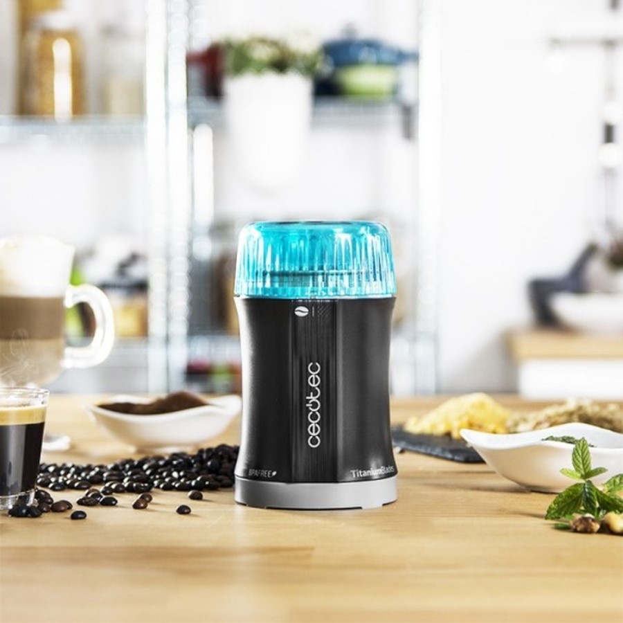 The Cecotec TitanMill 200 Coffee Mill Grinder in black is a compact, efficient appliance designed for grinding coffee beans and spices. With a powerful 200W motor and titanium-coated blades, it ensures a consistent, fine grind for optimal flavor extraction. The grinder features a durable design, easy-to-use one-touch operation, and a capacity to handle multiple cups of coffee. Its sleek black finish adds a modern touch, making it a practical and stylish addition to any kitchen.