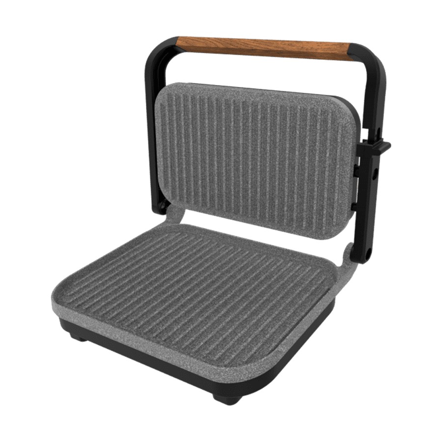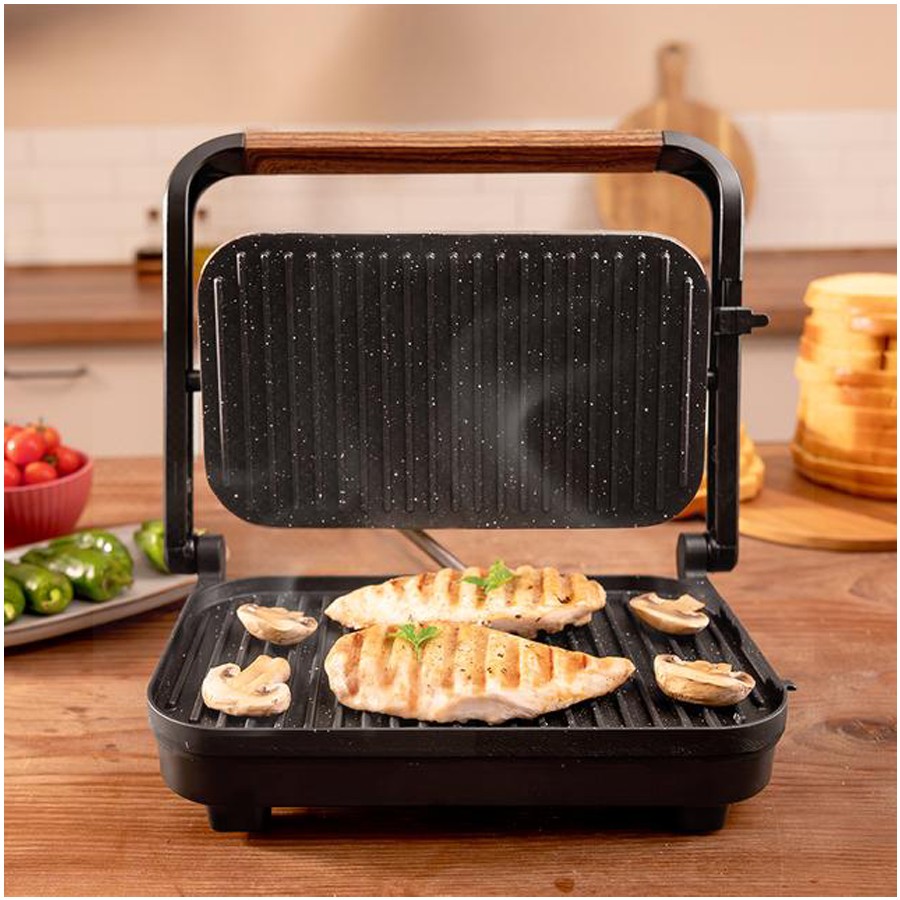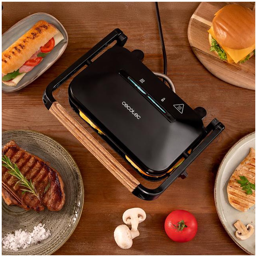 Fire up your indoor grill game with the Cecotec Rock’nGrill 1300 Wood B — a powerful 1,300 W electric grill featuring the premium RockStone stone coating for superior nonstick performance and durability Its sleek black design with wood accents brings style to your countertop, while a non-slip base and floating plate allow you to grill a variety of foods evenly and safely. Whether making juicy steaks, grilled sandwiches or vegetables, this grill delivers efficient heat and easy cleanup thanks to its detachable design.